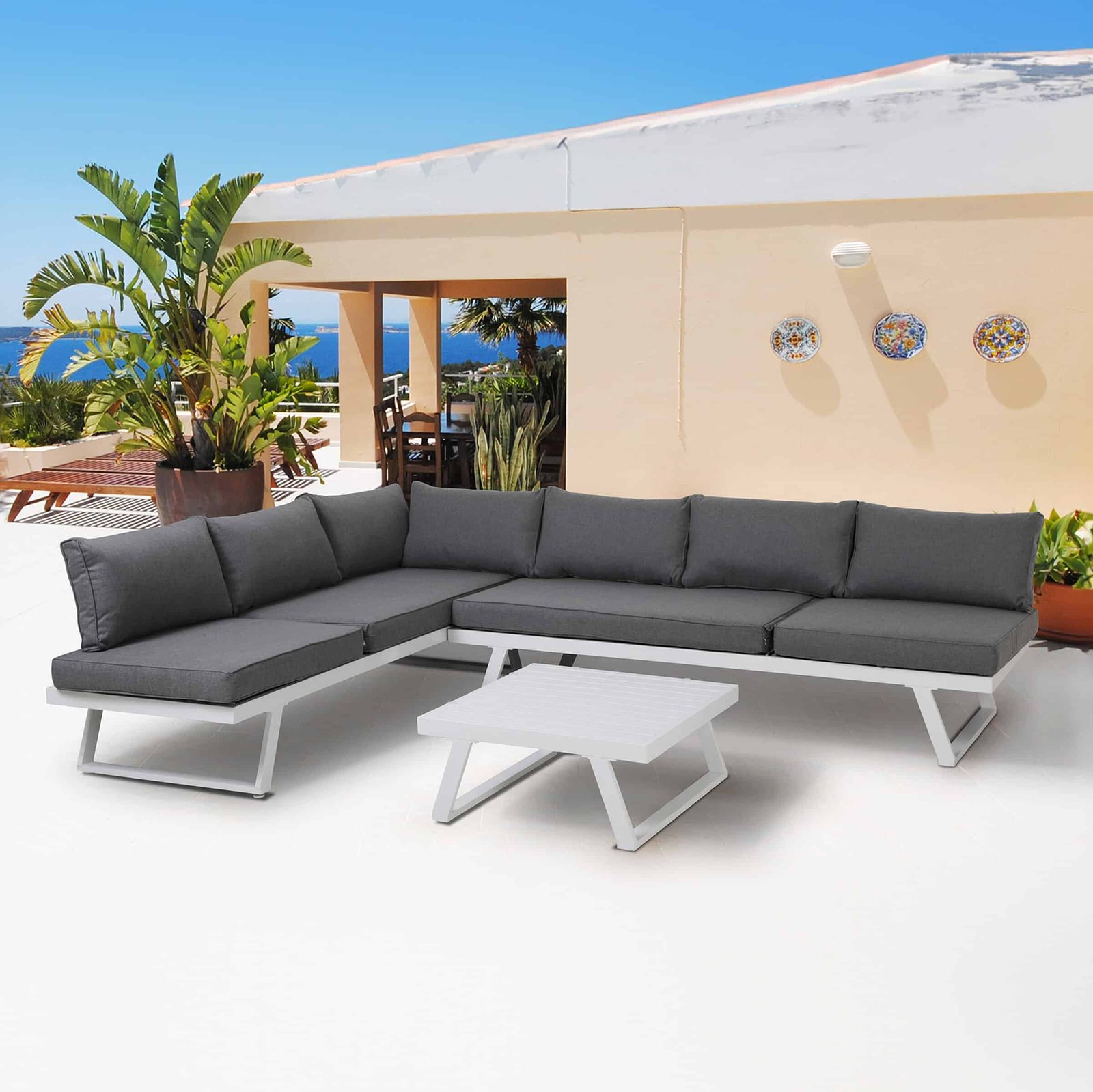 Deze moderne tuinzitgroep, bestaande uit een hoekbank, een salontafel, zit- en rugkussens, biedt plaats aan maximaal 7 personen. De hoge zitkussens en de comfortabele rugkussens die worden meegeleverd, bieden optimaal zitcomfort. De zitgroep is de ideale oplossing voor de tuin, het terras, de wintertuin enz. en biedt ruimte voor sociale bijeenkomsten, familiefeesten of barbecues. Het stalen frame is bijzonder duurzaam en robuust, waardoor het ideaal is voor buitengebruik. De moderne, rechtlijnige look wordt gecompleteerd door de antracietkleurige bekleding van de zitting. De poot van de bank kan naar wens naar links of rechts worden versteld.