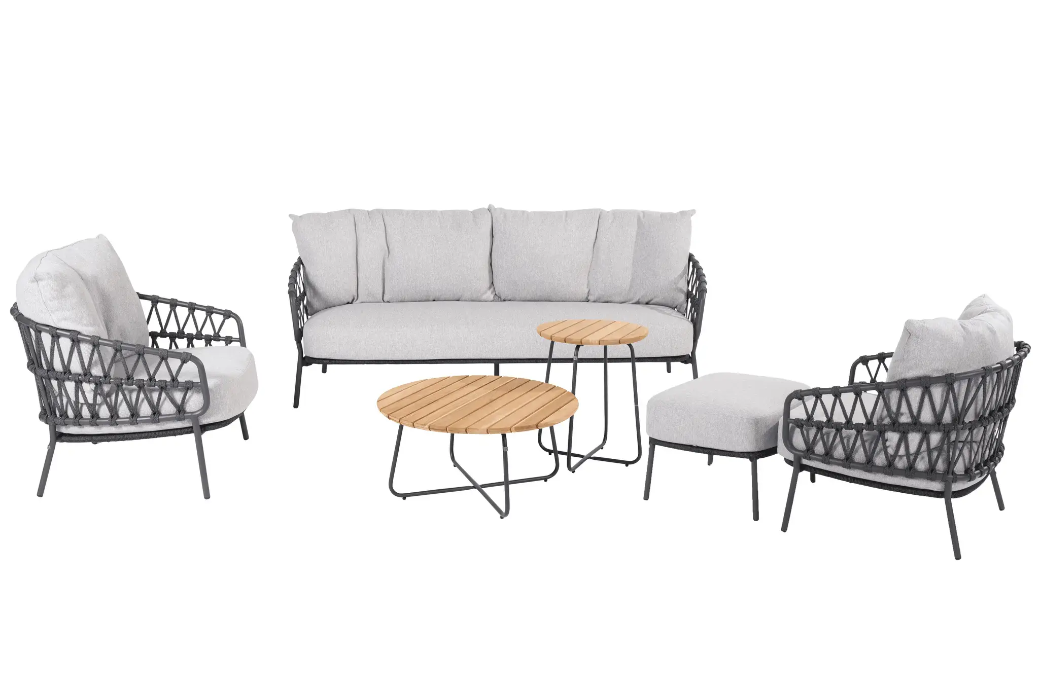 De Calpi loungeset met salontafels en voetenbank is een verfijnde toevoeging aan elke buitenruimte, of het nu een patio, terras of tuin is. Deze set combineert comfort, stijl en functionaliteit om een ontspannende en gastvrije omgeving te creëren voor buitenentertainment of gewoon voor rustige momenten in de buitenlucht.