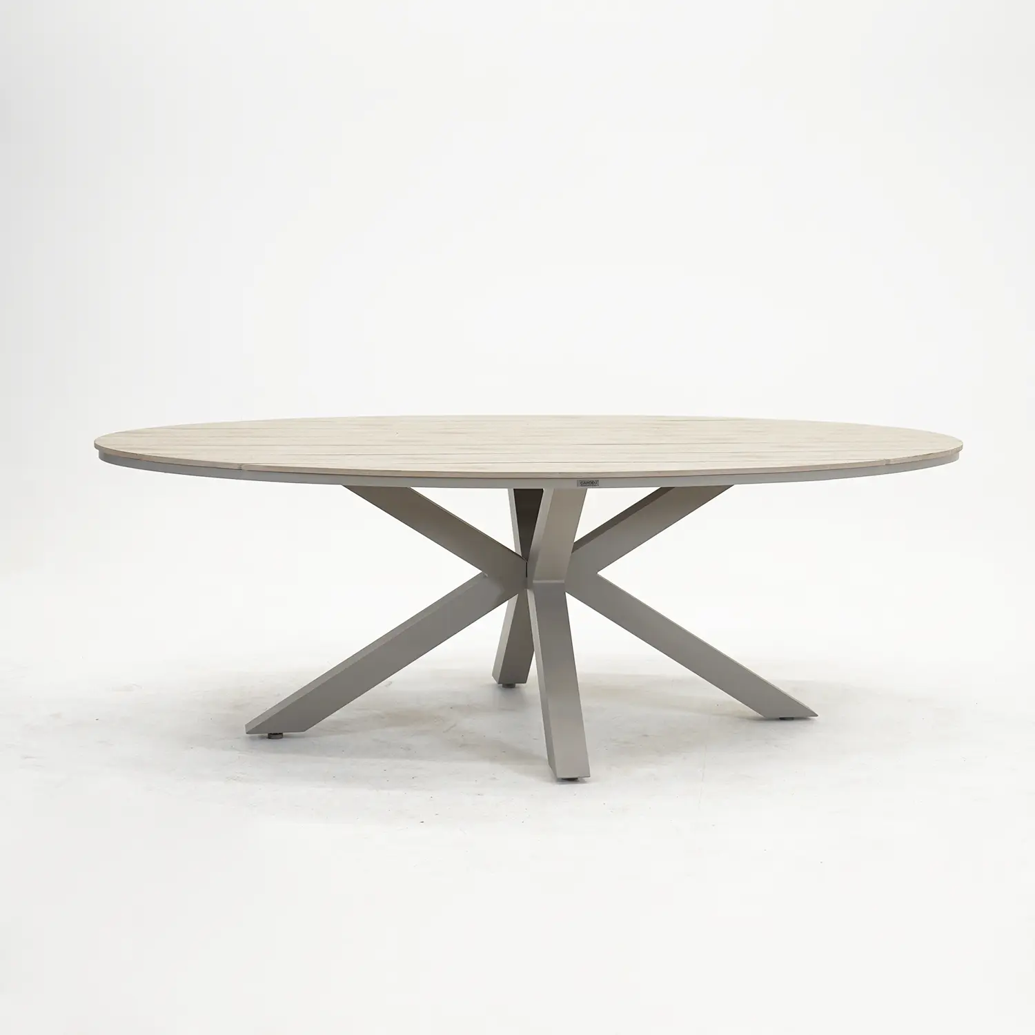 Ben jij op zoek naar een eettafel voor buiten in de tuin? Dan is de Edison tafel 220x115x75cm taupe/teak van het merk Garden Impressions misschien wel iets voor jou. Deze ovale tuintafel beschikt over een prachtig taupekleurig frame met een houtlook tafelblad, waardoor hij een stijlvolle uitstraling heeft en licht van kleur is. Hierdoor is deze tafel in elke tuin een ware blikvanger die je met veel verschillende diningstoelen kunt combineren. Denk hierbij aan de Prato dining stoel. Door de ovale vorm en de afmeting van 220×115 cm kun je tot wel zes stoelen aanschuiven. Hierbij heeft ook niemand last van de tafelpoten, doordat hij over een spinpoot beschikt. Onder deze tafelpoten zijn ook nog dopjes bevestigd. De dopjes beschermen zowel de ondergrond als de tafelpoot én zorgen ervoor dat de tafel stabiel kan blijven staan. Verder bestaat het tafelblad uit meerdere latten. Deze latten staan lichtjes uit elkaar, waardoor regenwater snel en makkelijk weg kan lopen. De tafel droogt hierdoor ook sneller, waardoor hij na een regenbui weer sneller gebruikt kan worden.