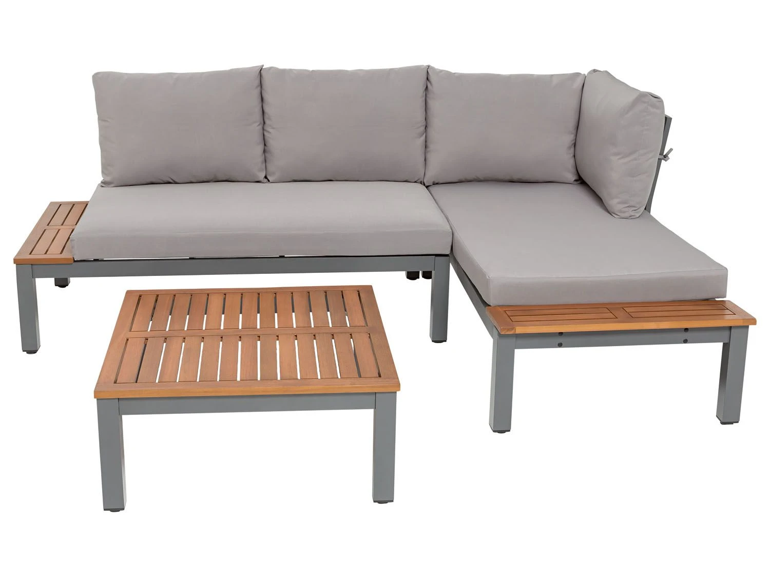 Productbeschrijving Maak je tuin helemaal af met deze loungeset voor in de hoek van je tuin of terras. Het mooie samenspel van aluminium en gecertificeerd hout geeft een warme toets aan de omgeving. En nu: chillen! Deze set bestaat uit 2 tweezits en 1 salontafel Gemaakt van gecertificeerd, eucalyptushout Max. belasting tweezit: 230 kg Max. belasting tafel: 50 kg Materiaal Gecertificeerd FSC-hout eucalyptus, aluminium, polyester Afmetingen Tweezit: 138,7 x 76,6 x 73 cm Tafel: 71,5 x 71,5 x 32,5 cm Zitkussens: 120 x 70 x 9 cm Rugkussens: 45 x 63 cm Gewicht 34 kg