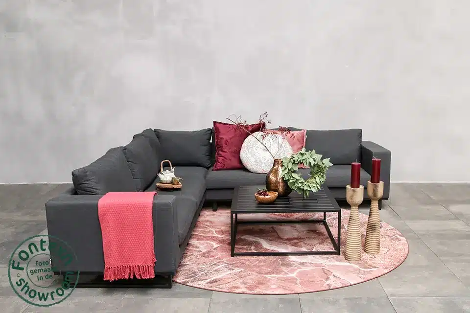 Introductie Fonteyn | Loungeset Ego | SootyHet Fonteyn | Loungeset Ego | Sooty van Fonteyn transformeert jouw buitenruimte tot een stijlvolle ontspanningszone. Deze imposante hoekbank van 285 x 285 cm combineert modern design met uitstekende functionaliteit en biedt comfortabele zitplaatsen voor vijf personen. Het donkergrijze Sunbrella textiel straalt verfijning uit en past perfect bij hedendaagse tuintrends.nnVerfijnde uitstraling die indruk maaktGeometrische vormen en strakke lijnen geven deze loungeset een tijdloze elegantie die elke tuin opwaardeert. De diepe Sooty-kleur creëert een neutrale basis die prachtig combineert met kleurrijke tuinaccessoires. Het aluminium frame draagt bij aan de moderne esthetiek, terwijl de volle kussens van 14 cm dikte zorgen voor een uitnodigende uitstraling die gasten direct aantrekt.nnVeelzijdige functionaliteit voor elke situatieDeze modulaire opzet past zich moeiteloos aan verschillende momenten aan, van intieme gesprekken tot gezellige familiebijeenkomsten. De L-vormige configuratie creëert een natuurlijke ontmoetingsruimte waar iedereen elkaar goed kan zien en horen. De bijgeleverde koffietafel van 90 x 90 cm vormt het praktische middelpunt voor drankjes, snacks en decoratie.nnDagelijks gemak dat het verschil maaktSunbrella textiel maakt onderhoud bijzonder eenvoudig door zijn water- en vuilafstotende eigenschappen. Regelmatig stofzuigen en af en toe afnemen met een vochtige doek houdt jouw loungeset in perfecte staat. Het lichtgewicht aluminium frame zorgt ervoor dat je elementen gemakkelijk kunt verplaatsen voor grondige reiniging of seizoensgebonden opslag.nnSlimme keuze voor jarenlang plezierAluminium en Sunbrella textiel vormen een winnende combinatie die seizoen na seizoen presteert. Het materiaal behoudt zijn eigenschappen en uitstraling gedurende vele jaren, waardoor je investering zich terugbetaalt door de langdurige bruikbaarheid. Deze duurzame materialen betekenen dat je loungeset een betrouwbare basis vormt voor talloze zomers vol buitenplezier.nnZekerheid van blijvende kwaliteitFonteyn garandeert kwaliteit die bestand is tegen alle weersomstandigheden en intensief gebruik. Het vakkundige vakmanschap zorgt ervoor dat elk onderdeel perfect op zijn plaats blijft en zijn functie behoudt. Deze loungeset blijft jarenlang het middelpunt van jouw buitenruimte, waarbij comfort en schoonheid hand in hand gaan.nnShowroom in UddelOntdek de kwaliteit van deze loungeset in de 35.000m2 grote showroom van Fonteyn in Uddel, Europa’s grootste tuinmeubelshowroom. Test het zitcomfort, voel de kwaliteit van het Sunbrella textiel en laat je adviseren door de interne experts van Fonteyn. Het uitgebreide assortiment, de grote voorraad en snelle levering maken jouw tuindromen direct waar. Raak je overtuigd? Bestel dan gemakkelijk via de webshop van Fonteyn.n