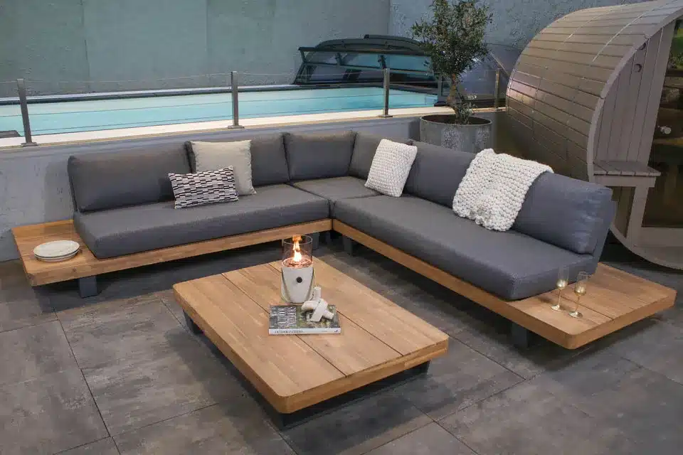 Introductie Fonteyn | Loungeset TorontoHet Fonteyn | Loungeset Toronto van Fonteyn transformeert jouw buitenruimte tot een luxueuze ontspanningsoase waar comfort en stijl samenkomen. Deze indrukwekkende hoekbank set combineert het natuurlijke karakter van massief teakhout met moderne designprincipes, resulterend in een meubel dat zowel tijdloos als eigentijds is. De L-vormige configuratie biedt royale zitgelegenheid voor het hele gezin en vrienden, terwijl de bijpassende salontafel het geheel compleet maakt voor perfecte buitenmomenten.nnElegante uitstraling voor jouw terrasMassief teakhout straalt een warme, natuurlijke elegance uit die jouw buitenruimte direct opwaardeert tot een stijlvolle loungezone. Het authentieke houtkarakter met zichtbare nerven en structuur geeft deze set een organische uitstraling die harmonieus samensmelt met elke tuinomgeving. Zachte grijze kussens vormen een prachtig contrast met het warme teakhout en zorgen voor een hedendaagse, verfijnde look. Decoratieve witte accent kussens voegen speelse textuur toe en maken de gehele compositie af tot een designstatement waar je trots op kunt zijn.nnDoordachte functionaliteit voor optimaal comfortElke component van deze loungeset is zorgvuldig ontworpen om maximaal zitcomfort en gebruiksgemak te bieden. De royale zitdiepte en ergonomische rugsteun zorgen ervoor dat je uren comfortabel kunt genieten van je buitenruimte. De bijpassende salontafel met teakhouten blad en strak zwart metalen onderstel biedt voldoende ruimte voor drankjes, hapjes en decoratie. Door de L-vormige opstelling ontstaat een natuurlijke conversatiehoek waar iedereen zich welkom en betrokken voelt tijdens gezellige bijeenkomsten.nnGebruiksgemak dat het verschil maaktTeakhout biedt van nature uitstekende weerbestendigheid en vraagt minimaal onderhoud, waardoor je extra tijd hebt om te genieten van je loungeset. De afneembare kussenhoezen kunnen eenvoudig worden gereinigd, terwijl het massieve houten frame zichzelf praktisch onderhoudt door zijn natuurlijke oliën. Het modulaire ontwerp geeft je de vrijheid om de opstelling aan te passen aan verschillende gelegenheden of seizoenen. Gladde oppervlakken laten zich moeiteloos reinigen en behouden hun natuurlijke schoonheid met slechts incidentele zorg.nnSlimme investering in duurzaam comfortDeze Toronto loungeset vertegenwoordigt een doordachte keuze voor wie langetermijnwaarde zoekt in tuinmeubilair. Massief teakhout staat wereldwijd bekend om zijn uitzonderlijke duurzaamheid en wordt mooier met de tijd door de natuurlijke patina-ontwikkeling. Het tijdloze ontwerp zorgt ervoor dat deze set relevant blijft, ongeacht veranderende trends in tuininrichting. Door te investeren in kwaliteitsmaterialen en vakmanschap krijg je jarenlang zorgeloos genieten van luxueus buitencomfort.nnZekerheid van langdurige kwaliteitFonteyn garandeert dat deze loungeset Toronto zijn superieure kwaliteit behoudt, seizoen na seizoen. Het zorgvuldig geselecteerde teakhout ondergaat grondige kwaliteitscontroles en wordt vakkundig verwerkt tot stabiele, duurzame meubels. Hoogwaardige kussenvulling behoudt zijn vorm en comfort, zelfs na intensief gebruik. Deze investering in kwaliteit betekent dat je jarenlang kunt rekenen op dezelfde luxe en het comfort dat deze set vanaf de eerste dag biedt.nnShowroom in UddelErvaar de kwaliteit van de Fonteyn | Loungeset Toronto in de grootste tuinmeubelshowroom van Europa in Uddel, waar 35.000m2 gevuld is met inspiratie en mogelijkheden. Hier kun je persoonlijk het comfort van deze loungeset testen, het massieve teakhout voelen en advies krijgen van Fonteyns interne tuinmeubelexperts. Het brede assortiment, grote voorraad en snelle levering zorgen ervoor dat je snel kunt genieten van jouw nieuwe buitenmeubels. Ben je al overtuigd van deze prachtige loungeset? Dan kun je deze ook direct bestellen via de webshop van Fonteyn.n