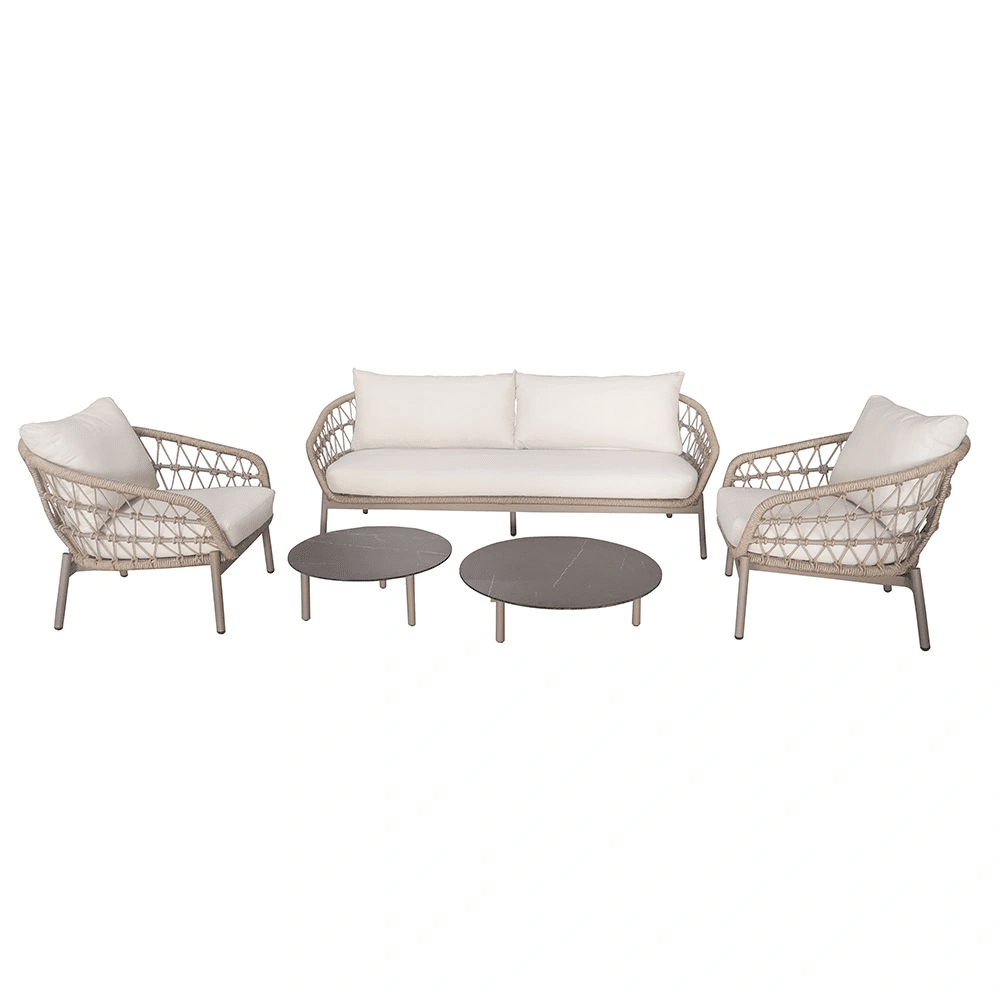Ontworpen voor comfort en uitstraling: de Kaprun Sofa Loungeset – Bruin/Wit Buitengewoon de Boet in grijs en wit en beige kleurstelling met een basis van rope. Ideaal voor wie stijl en comfort wil combineren in één buitenmeubel.