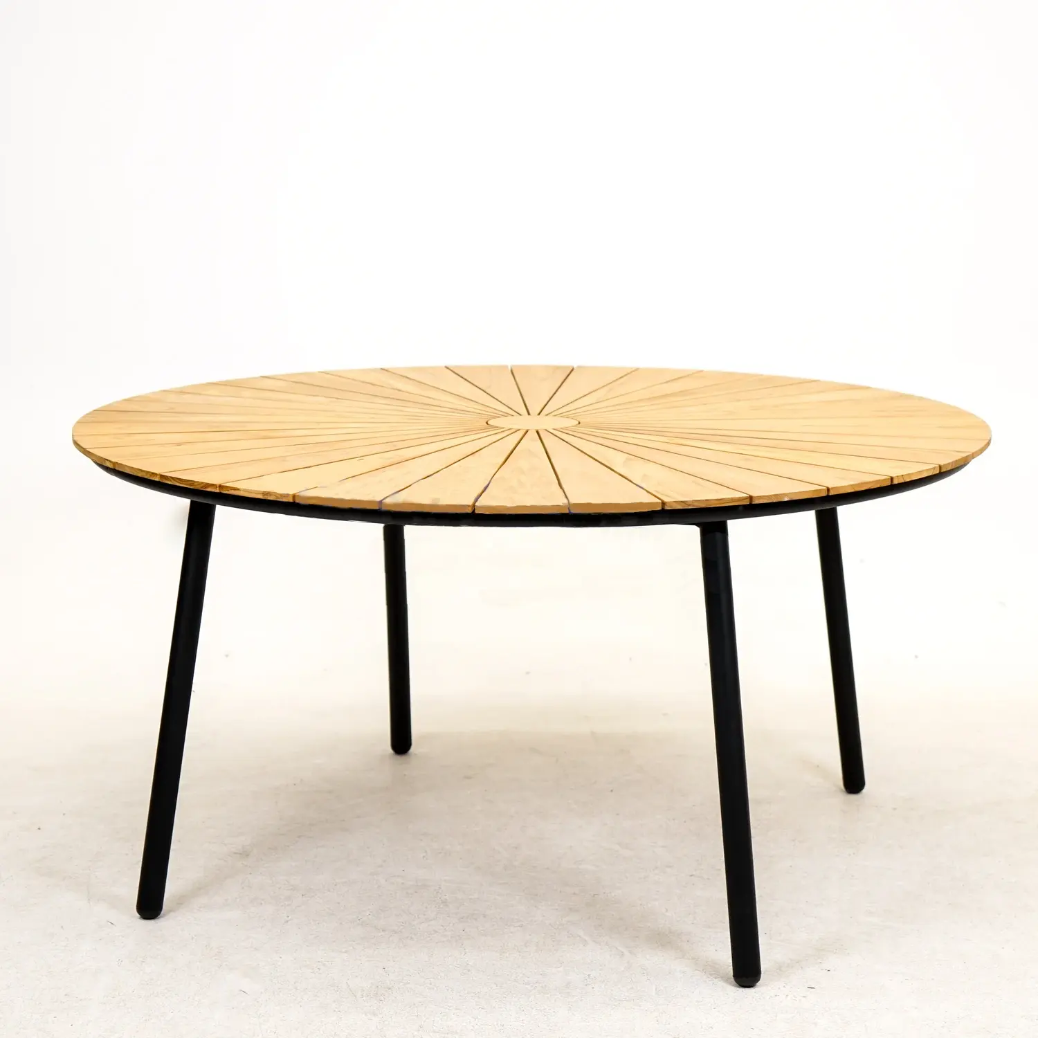 Ben jij op zoek naar een perfecte aanvulling voor in jouw tuin of onder jouw overkapping? Dan zou je die met de Lavras Dave Teak Tuintafel 150 cm Rond Vita van het merk Vita gevonden kunnen hebben. Deze tuintafel is uniek in zijn soort door het patroon van het tafelblad. In het ronde tafelblad zit in het midden een cirkel, vanaf deze cirkel gaan de planken van smal naar steeds breder aan de buitenkanten, dit geeft het effect alsof het een zon is. Onder dit tafelblad zit het onderstel van de tafel, deze bestaat uit vier vrij dunnen tafelpoten. Het fijne van zulke dunne tafelpoten is dat ze niet in de weg zitten als jij er met verschillende mensen aan gaat zitten om buiten te eten.