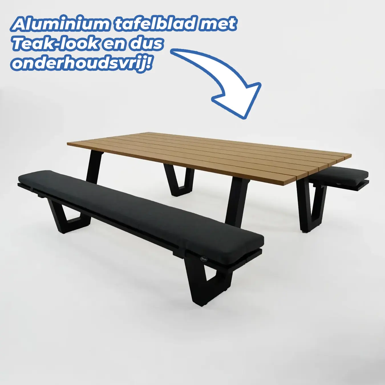 Het frame van deze picknickset is vervaardigd uit aluminium. Dit materiaal is sterk, licht van gewicht, onderhoudsvriendelijk, slijtvast en weersbestendig. Ook het tafelblad is vervaardigd uit aluminium, maar beschikt over een teakhouten look. De meegeleverde kussens zijn vervaardigd uit Olefin. Olefin voelt erg zacht aan en is sterk, onderhoudsvriendelijk, vorst- en Uv-bestendig en weersbestendig.