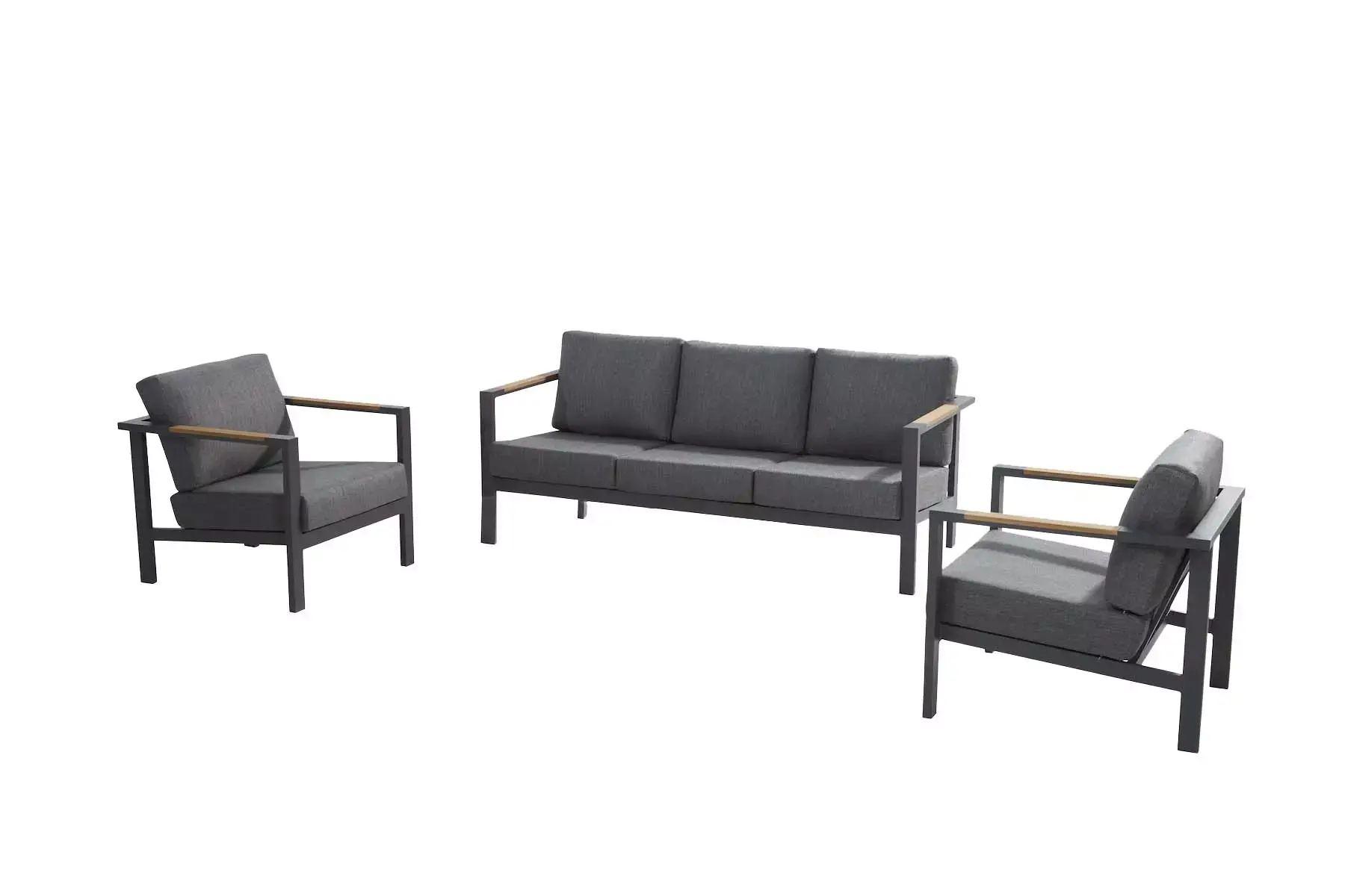 Het frame van zowel de bank als de stoelen is vervaardigd uit antraciet gepoedercoat aluminium. Aluminium is een sterk, onderhoudsvriendelijk en weerbestendig materiaal, dat tevens licht van gewicht is. Door aluminium te poedercoaten is er een extra beschermlaag gecreëerd tegen weer en wind. Het frame van de armleuningen is afgewerkt met teakhout. Teakhout is een houtsoort dat bekend staat om haar hoge kwaliteit. Het is tevens een graag gezien materiaal bij tuinmeubels, omdat het er modern uitziet en weerbestendig is.