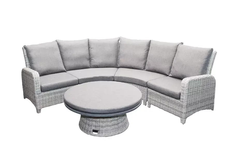 De Lucia loungeset is een ronde loungeset die bestaad uit een 4 delige loungebank inclusief in hoogte verstelbare salontafel. De Lucia Loungeset is gemaakt van een dik wicker vlechtwerk in de kleur Leaf grijs. De loungeset is uit te breiden met de Lucia loungestoel, Lucia bijzettafel en Lucia voetenbank.
