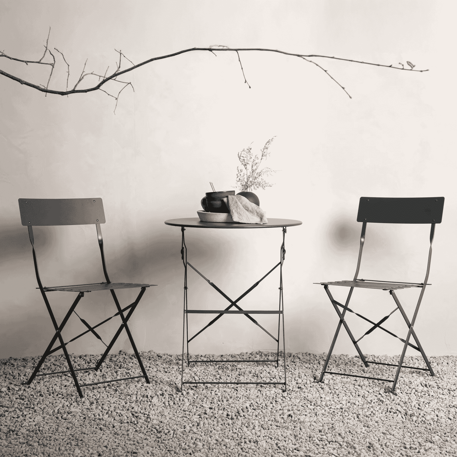 Een nette en gladde bistroset in donkergrijs die gemakkelijk kan worden ingeklapt. Zowel stijlvol als praktisch zodat je er andere dingen bij kunt doen als het meubel niet gebruikt wordt. Neem een kopje koffie en geniet hier van de lente tot de herfst!