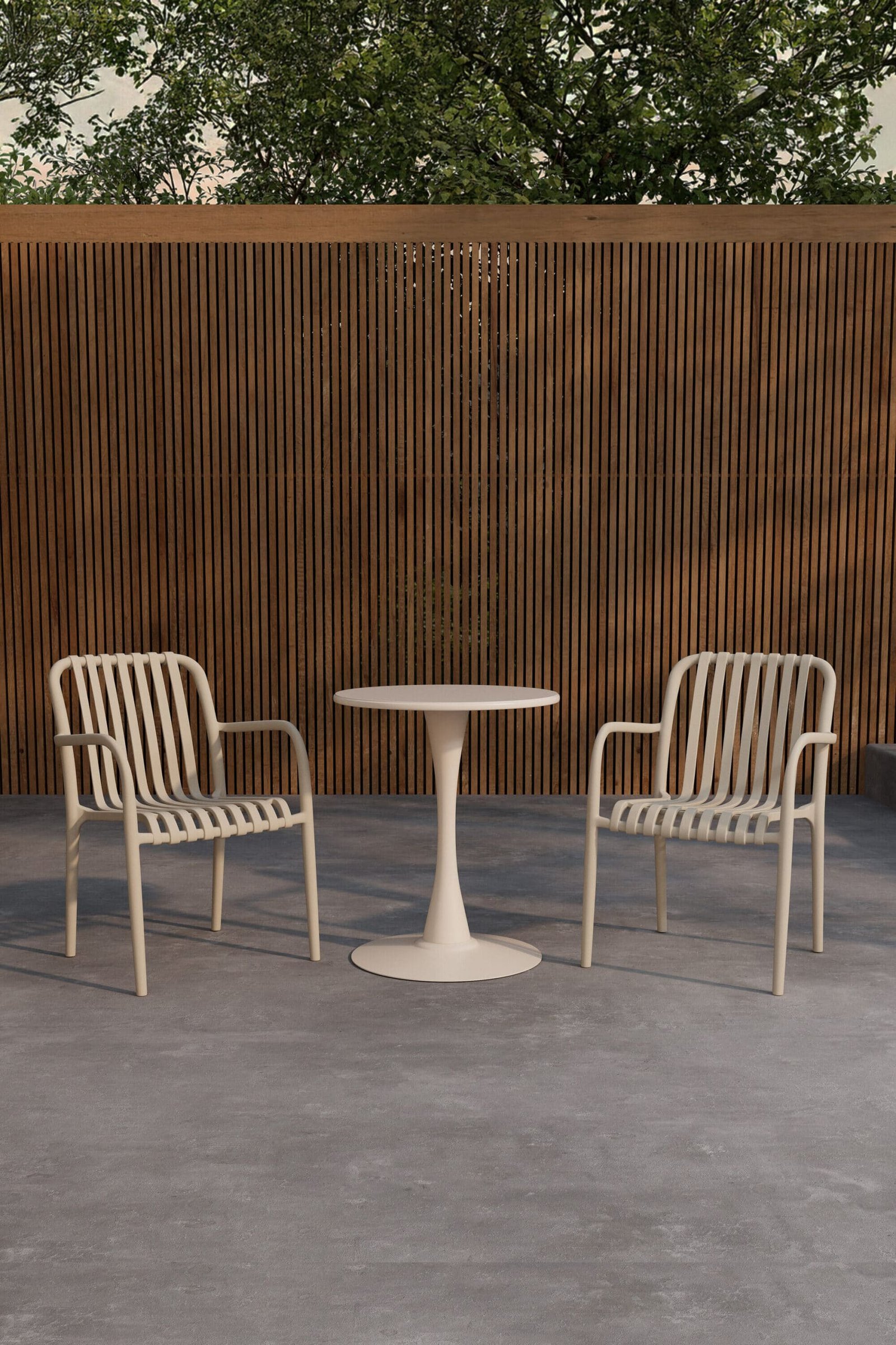 De Takeisha caféset in beige is een stijlvolle en handige oplossing voor je balkon, terras of tuin. De set bestaat uit twee comfortabele stoelen en een ronde tafel in een mooi ontwerp dat zorgt voor een moderne en harmonieuze uitstraling. Door de tijdloze beige kleur past Takeisha makkelijk in verschillende omgevingen en wordt het een gezellige plek voor koffie, ontbijt of een rustig momentje in de zon.