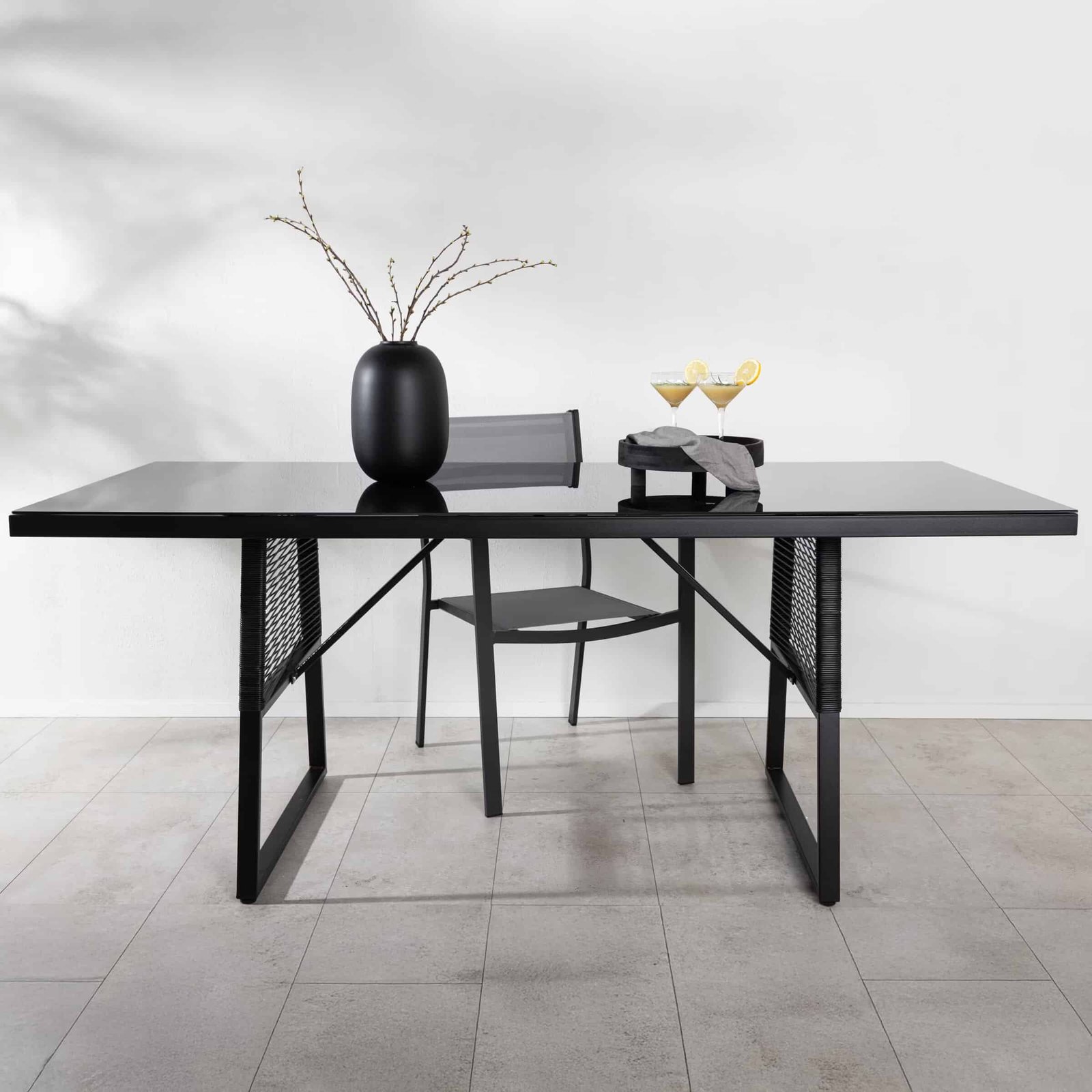 Marye is een rechthoekige eettafel van zwart aluminium. Het tafelblad is van donker glas, het onderstel heeft mooie touwdetails die de tafel een eigenwijze en smaakvolle uitstraling geven. Combineer met stoelen uit dezelfde serie voor een complete eetgroep. Maak je klaar voor heerlijke zomermomenten met familie en vrienden!