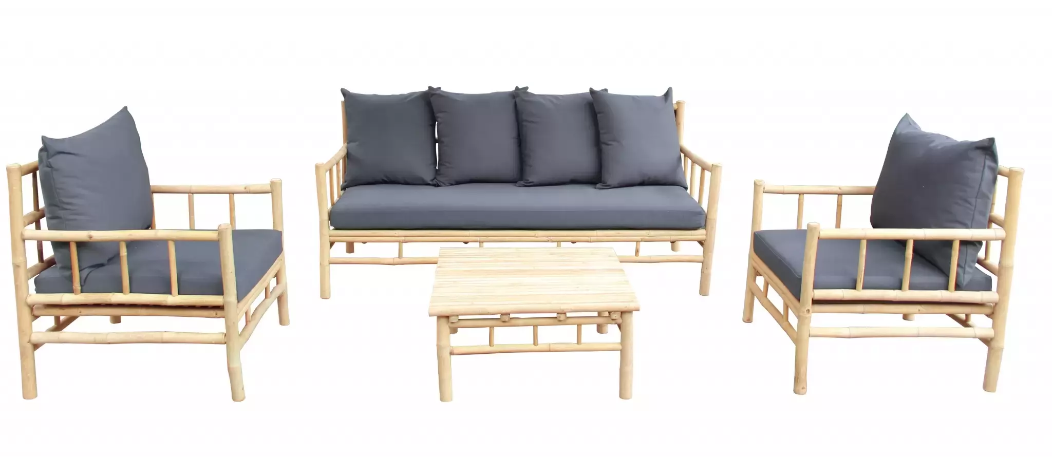 De tuinset Vita Bamboo is een mooi vormgegeven loungeset. Deze loungeset zal een ware eyecatcher zijn in je tuin. De loungeset Vita Bamboo heeft een prachtig design en de antraciet kussens maken de look compleet. Daarnaast zorgen de kussens niet alleen voor een prachtige look, maar ook voor een stevige en comfortabele zit. De tuinset is gemaakt van Bamboe, dit materiaal zorgt voor een direct tropische sfeer in de tuin. Deze loungeset is gemaakt van hoogwaardig Bamboe, het voordeel hiervan is dat het een duurzaam materiaal is.