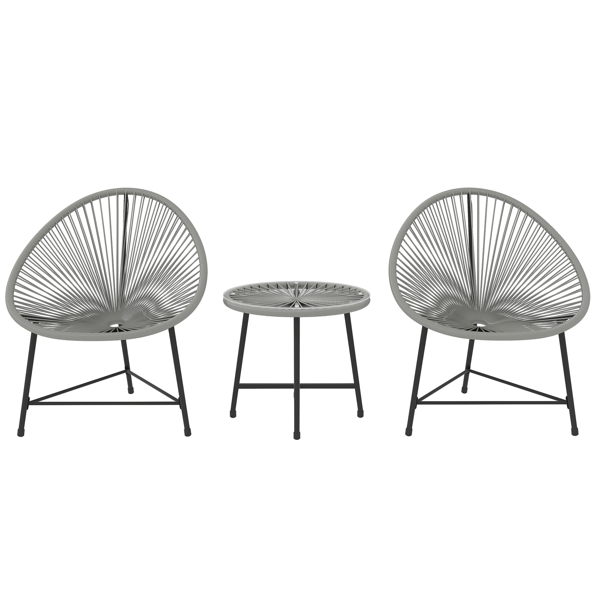 Ontspan buiten met deze elegante Outsunny balkonmeubelset, die twee ovale Acapulco-stijl stoelen en een bijpassend salontafeltje bevat. Flexibele kunststofrattan-snoeren met een hol gevlochten ontwerp van de bistroset zorgen voor een koele en comfortabele zit. Het salontafeltje met gehard glas is stijlvol en eenvoudig schoon te maken. De stalen frames en verstelbare voetdoppen garanderen stabiliteit en ondersteuning. Geniet van het comfort van deze stijlvolle balkonmeubelset.