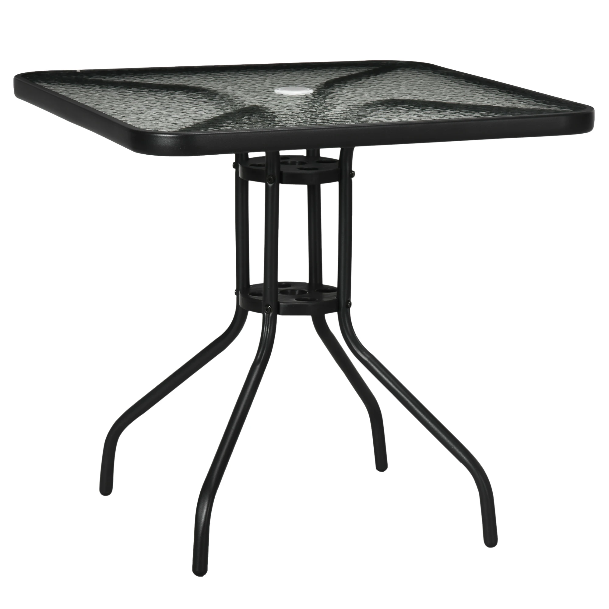Geniet van de frisse lucht met deze elegante Outsunny vierkante weerbestendige tuintafel. Het robuuste stalen frame en de lange poten van de tuintafel zorgen voor optimale stabiliteit. Het tafelblad van gehard glas is stevig, heeft een textuur voor stijl, en bevat een gat voor een parasol om u tegen de zon te beschermen. Perfect voor de komende seizoenen.