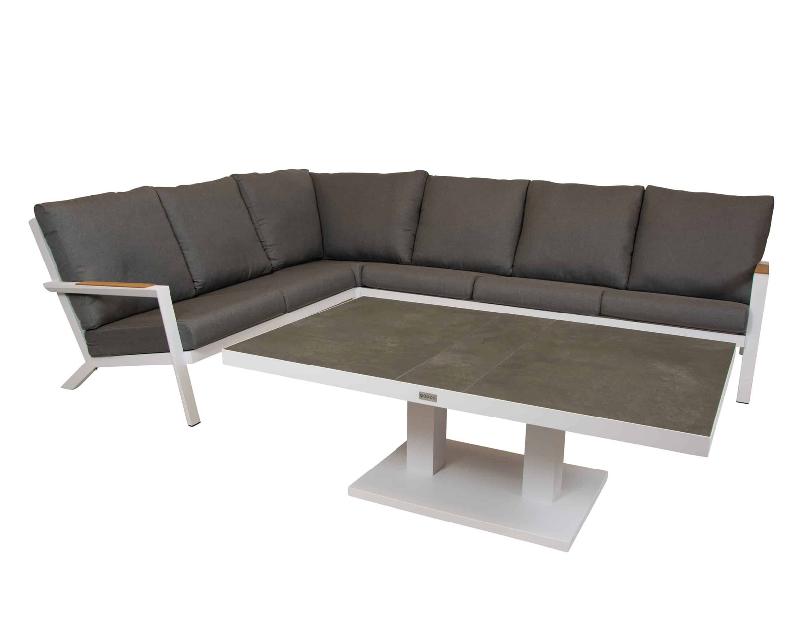 Lounge hoekset Okion in mat witDeze comfortabel lounge set met een 3-zits hoek en 2-zits. is zowel links als rechts te monteren. het frame is van onderhoud vriendelijk aluminium gepoedercoat in mat wit. de kussens zijn van olifin stof wat zeer goed kleur echt is en uitermate geschikt voor tuinmeubelsset bestaat uit3-zits 201 cm breed x 96 cm diep en 79 cm hoog2-zits 136 cm breed x 96 cm diep en 79 cm hooghoek element 96cm x 96 cm en 79cm hoogzithoogte incl. kussen 44 cmarmlegger hoogte 56 cmtotale hoek is 297cm x 232 cmDe Gazoo verstelbare tafel van Qopps is 140 bij 85 cm breed.Hoogte bovenkant blad: 46 cm – 72 cm.Hoogte onderkant blad op de hoogste stand: 67 cm.De tafel heeft een wit aluminium frame. De tafel is traploos te verstellen. Dit maakt deze tafel ideaal om aan te loungen of aan te eten. Het aluminium frame is gepoederd coat wit en heeft een strakke vormgeving. Het blad is van antraciet kleurige keramische tegels. Dit is zeer onderhoud vriendelijk. Op deze tafel zit 3 jaar