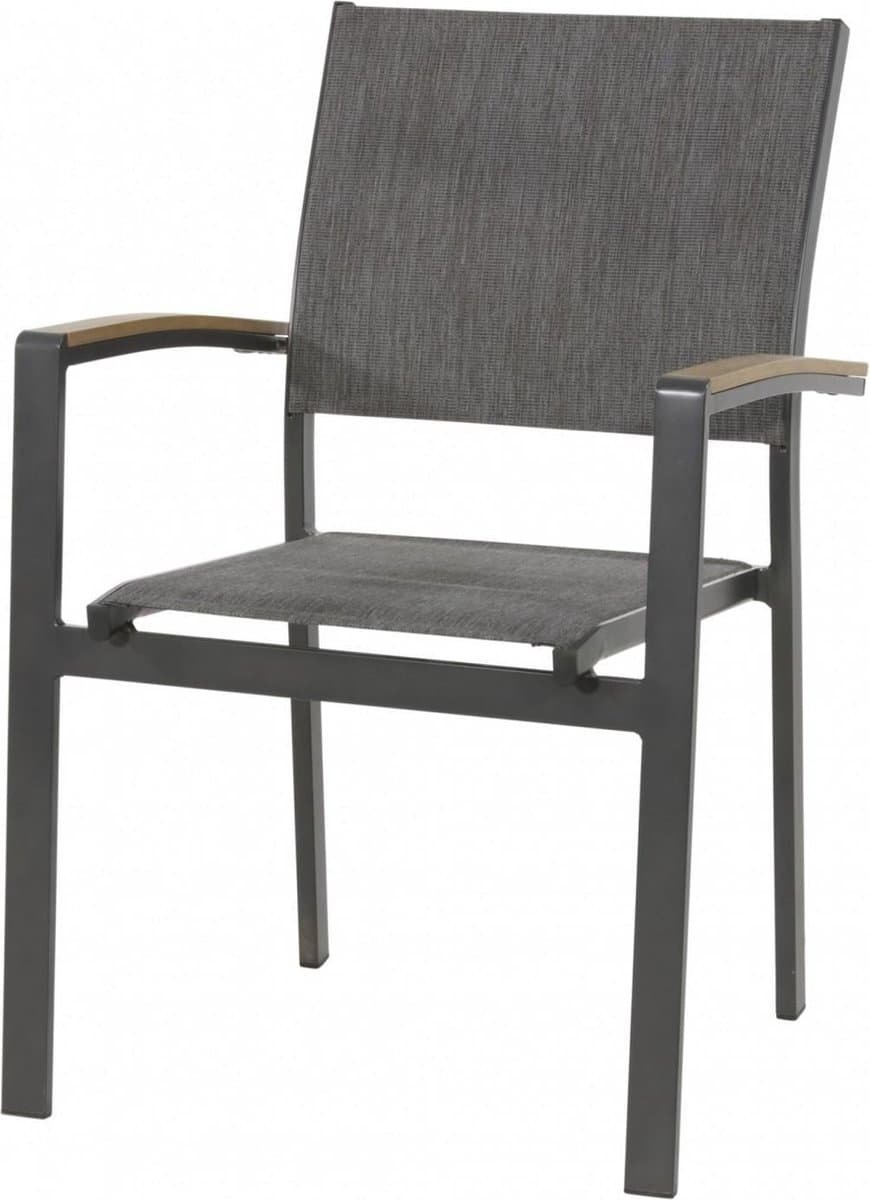 Stapelstoel Arezzo. Stapelstoel Arezzo is een handige stapelstoel van Lesli Living. Dit artikel heeft de volgende kenmerken: 57x62x87 cm aluminium frame antraciet, armleuning teaklook polywood. 490gr/m² textilene met olefin grijs/bruin design, maximaal draaggewicht: 100 kg. .