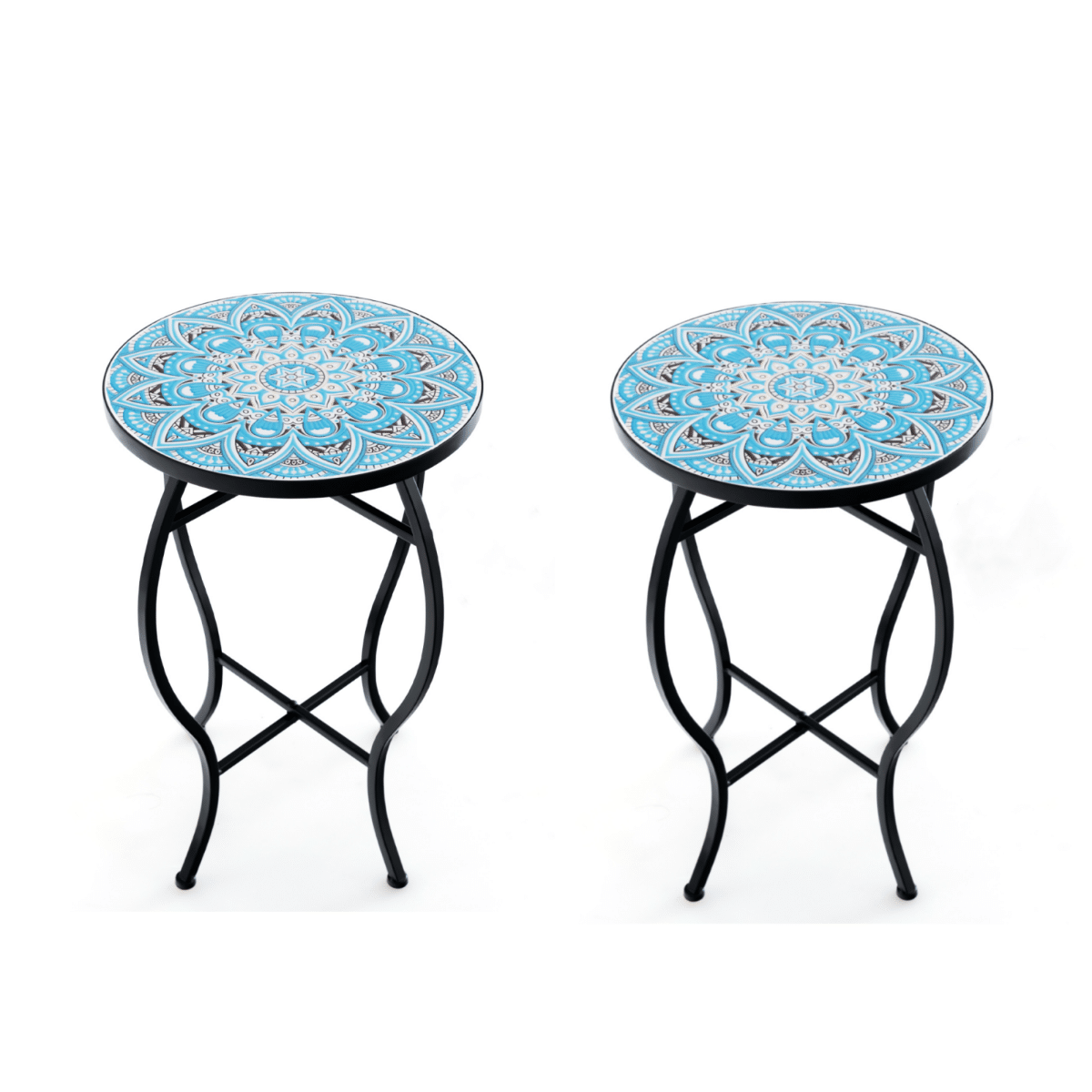 (Twee) Bijzettafel met Mozaïek voor Buiten Kleine 35 cm Ronde Salontafel met Keramisch Tegelblad Plantenstandaard Blauw