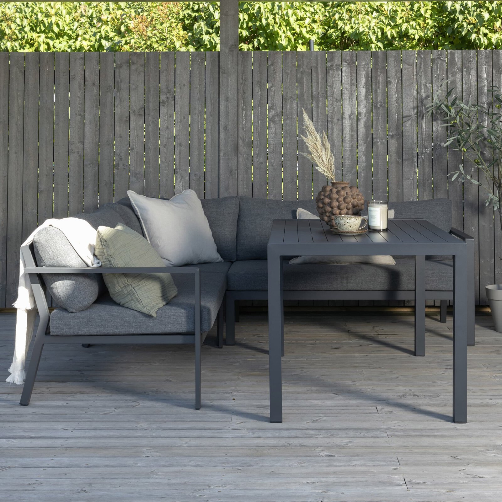 De hoekgroep van Ramo is geweldig voor wie veel rondhangt en een groter terras of patio heeft! Met zijn tijdloze ontwerp en duurzame materialen is het een meubelstuk dat vele jaren meegaat. Perfect voor een kopje koffie of waarom niet een boek lezen in de zon? Het frame is van zwart gelakt aluminium met kussens in grijs.