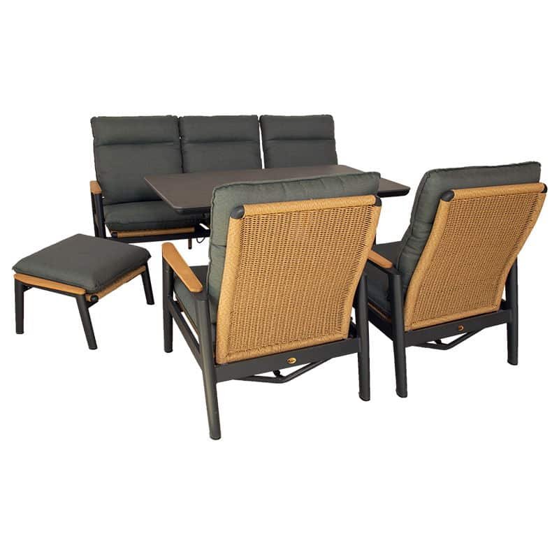 Louviers lounge set midnight grey. De Loungeset Louviers uit de eigen collectie is een mooie en sfeervolle loungeset. De set bestaat uit een 3 zitsbank, 2 loungestoelen en 2 praktische tafeltjes. De bank en stoelen zijn afgewerkt met een mooi teak houten armleuning. De lounge tafels zijn in 2 verschillende afmetingen en hoogtes om een speels effect te creëren. De loungeset wordt geleverd inclusief kussens.