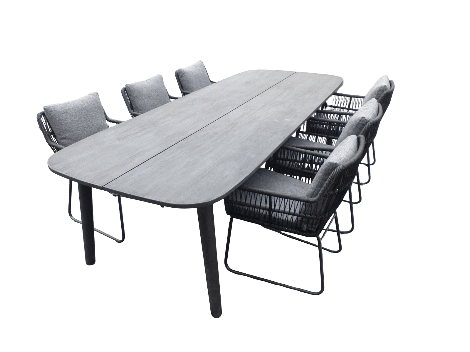 Set van Lennon tafel 280x110x76 cm charcoal en 6 Ran stoelen panther incl. kussens Yoi – Yoi
