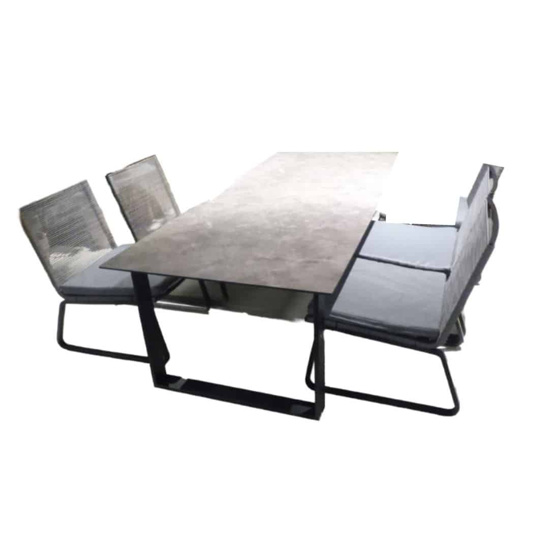 Tuinset Teeburu low dining tafel black, concretee 240×100 cm met 4 stoelen Kome lounge stoel black, rope dark grey Yoi – Yoi