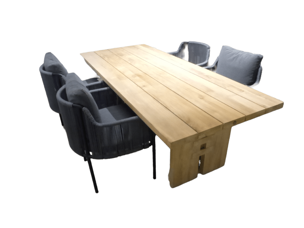 Tuinset Zen tafel teak 240×100 cm met 4 stoelen Umi stoel + kussen black, rope dark grey – grey, rope green. Ontdek de perfecte harmonie tussen stijl en comfort met Yoi’s exclusieve tuinsets. Creëer een oase van luxe in jouw buitenruimte.