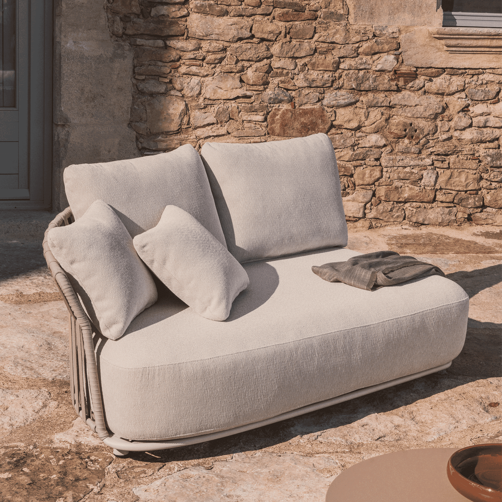 De Osani-collectie is ontworpen voor binnen- en buitenruimtes en heeft een serene uitstraling. De aluminium structuur is lichtgewicht en bestand tegen oxidatie, corrosie en UV-straling, geschikt voor continu gebruik in de buitenlucht. De rugleuning van handgevlochten touw bepaalt het karakter van het meubel en biedt comfortabele ondersteuning, en hij blijft in goede staat bij blootstelling aan de zon. De kussens hebben afneembare hoezen voor eenvoudig onderhoud. We raden aan om de kussens op regenachtige dagen op te bergen. Bovendien heeft hij kunststof bescherming onder de poten om de vloer te beschermen.