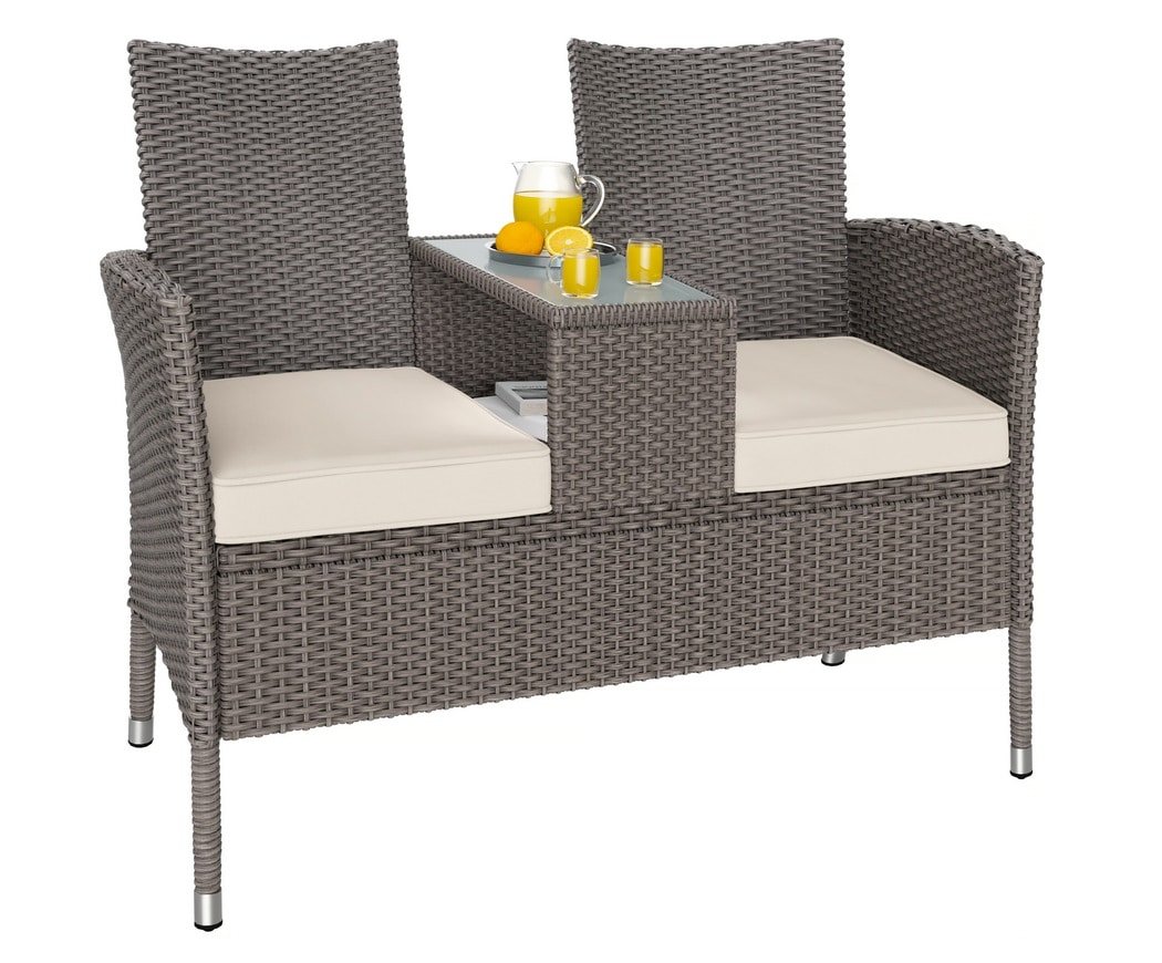 De polyrattan tuinbank van CASARIA® is een stijlvolle aanwinst voor jouw tuin. De bank in een moderne, tijdloze look maakt indruk met zijn handgeweven polyrotan vlechtwerk. Geniet van ontspannende uren samen in jouw tuin, op jouw terras of balkon. De gezellige zitkussens zorgen voor een comfortabel zitgevoel. Een bijzonder hoogtepunt is de geïntegreerde tafel in het midden van de bank. Plaats jouw drankjes, smartphone, tablet of andere gebruiksvoorwerpen op het elegante glazen blad of berg ze op onder het tafelblad in de speciaal daarvoor bestemde opbergruimte. Het gepoedercoate frame van robuust staal is tot 120 kg per kant belastbaar. De comfortabele zitkussens hebben een hoge schuimdichtheid en grammage. De stoelhoezen zijn waterafstotend, afneembaar en wasbaar. Poly rotan is een zeer stabiele, gelijkmatig gewikkelde kunststofvezel die speciaal is ontwikkeld voor tuinmeubelen. Het materiaal is weerbestendig, bestand tegen UV-licht, vuilafstotend en gemakkelijk schoon te maken. Maak het jou gemakkelijk en geniet van de zomer op het terras of in de tuin. Productvoordelen: 2 zits bank ideaal voor balkon of terras Polyrattan – weerbestendig, UV-bestendig, vuilafstotend zeer gemakkelijk schoon te maken aangenaam zitcomfort 7 cm dik kussen Kussens zijn dubbel gelijnd modern ontwerp Technische gegevens: Materiaal bank: polyrattan / metaal Materiaal kussens: 100% polyester Afmetingen (bxdxh) (bank): 143 x 55 x 88 cm Afmetingen (bxdxh) (tafel): 52 x 39 x 22 cm Kleur: Creme Leveringsomvang: 1 x Polyrattan tuinbank Montage instructie