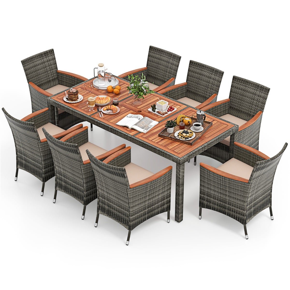 9-Delige Rotan Tuinset voor 8 Personen Acacia Tafelblad Patio Eetset met Afneembare Kussens Draagvermogen Stoel 180kg
