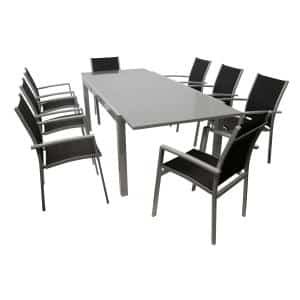 Alghero aluminium tuinset – Aluminium Textiel Glas – Grijs Zwart9-delige set van aluminium en zwart kunststof9-delige set: Een complete set bestaande uit 8 stapelstoelen met armleuningen en een uitschuiftafel van 180/240x100cm. Het frame is gemaakt v…
