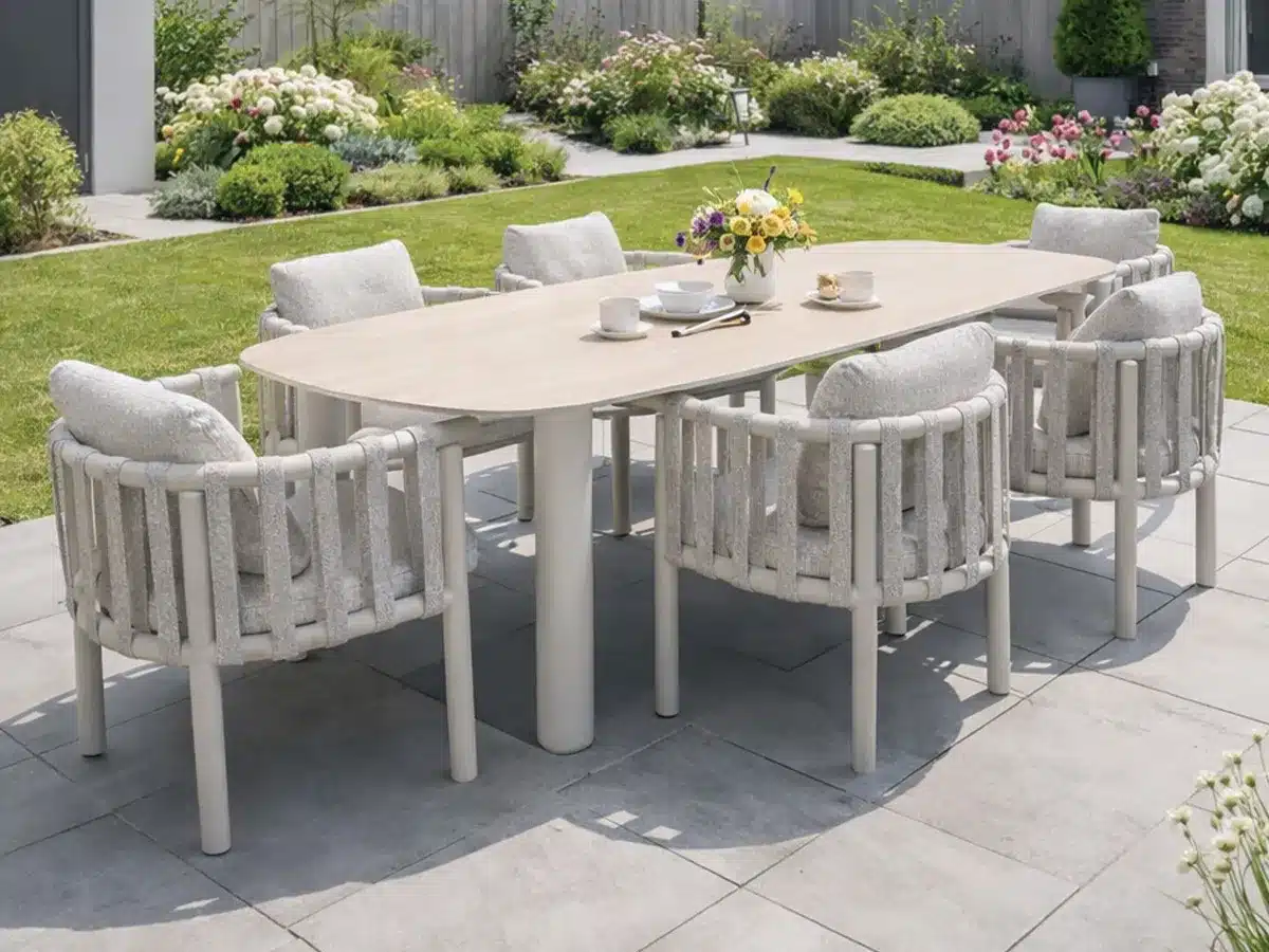 Introductie Fonteyn Sifra tuinsetHet Fonteyn Sifra tuinset van Fonteyn brengt luxe en comfort samen in één elegante tuinoplossing. Deze verfijnde 8-delige set transformeert jouw buitenruimte tot een stijlvolle ontmoetingsplek waar familie en vrienden samenkomen voor onvergetelijke momenten. Het doordachte ontwerp combineert moderne esthetiek met praktische functionaliteit, waardoor je jarenlang kunt genieten van superieure kwaliteit.nnStijlvolle uitstraling voor jouw tuinDeze tuinset straalt sophisticatie uit door de verfijnde rope weaving die warmte en karakter aan jouw buitenruimte toevoegt. Het elegante aluminium frame en de luxe olefin bekleding creëren een harmonieuze balans tussen modern design en tijdloze elegantie. Jouw tuin krijgt instant een upgrade naar een professioneel ingerichte lounge waar comfort en stijl hand in hand gaan.nnOptimale functionaliteit voor dagelijks gebruikDe ruime tafel van 240 x 110 cm biedt voldoende ruimte voor uitgebreide diners en gezellige samenkomsten. Het krasbestendige sintered stone tafelblad is weerbestendig en behoudt zijn mooie uitstraling door alle seizoenen heen. Elke stoel is voorzien van royale zittingen met quick dry foam technologie, waardoor ze binnen korte tijd droog zijn na regen.nnGemakkelijk onderhoud en gebruikHet lichtgewichte aluminium frame maakt het eenvoudig om de stoelen te verplaatsen wanneer je de indeling wilt aanpassen. Het sintered stone tafelblad vereist minimaal onderhoud en behoudt zijn uitstraling door alle seizoenen heen. De quick dry foam in de kussens zorgt ervoor dat je snel weer van je tuinset kunt genieten, zelfs na onverwachte buien.n