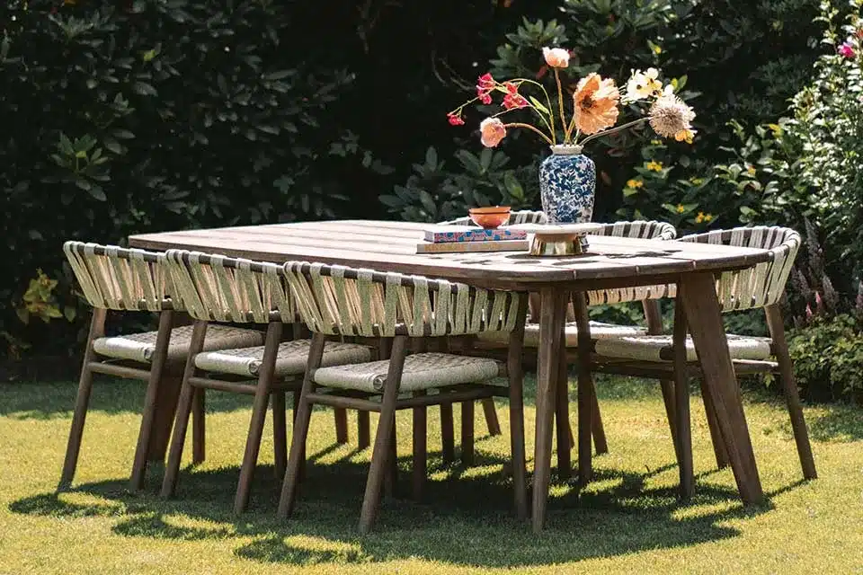 Introductie Fonteyn | Tuinset Dalia-Rixos | WalnutDeze Fonteyn | Tuinset Dalia-Rixos | Walnut van Fonteyn combineert de warme uitstraling van acacia hout met het natuurlijke comfort van gevlochten materialen. Deze elegante tuinset bestaat uit een ruime rechthoekige eettafel van 240 x 100 cm en zes bijpassende stoelen. Het karakteristieke ontwerp kenmerkt zich door schuin geplaatste poten en een matte houtafwerking die de natuurlijke houtnerven prachtig benadrukt.nnTijdloze elegantie die jouw tuin transformeertAcacia hout in walnut-tint straalt rijke warmte en natuurlijke elegantie uit die jouw buitenruimte instant opwaardeert. Het matte tafelblad laat de authentieke houtstructuur volledig tot zijn recht komen, terwijl de slanke, schuin geplaatste poten zorgen voor een moderne twist. De gevlochten rugleuningen en zittingen in beige en crèmekleuren creëren een perfecte balans tussen hedendaags design en organische warmte, waardoor jouw terras een luxueuze uitstraling krijgt.nnDoordachte functionaliteit voor optimaal comfortHet genereuze tafeloppervlak van 240 x 100 cm biedt voldoende ruimte voor zes personen, inclusief servies en decoratieve elementen. De zithoogte van 47 cm en zitdiepte van 45 cm garanderen een ergonomische zithouding tijdens langere maaltijden. Het gevlochten materiaal van de stoelen zorgt voor natuurlijke ventilatie en flexibiliteit, wat bijdraagt aan het zitcomfort tijdens zwoele zomeravonden.nnEenvoudig onderhoud en praktisch gebruikAcacia hout bezit van nature goede weersbestendige eigenschappen en vraagt minimaal onderhoud van jouw kant. De matte afwerking verbergt kleine gebruikssporen en vingerafdrukken effectief, waardoor jouw tuinset er altijd verzorgd uitziet. Het gevlochten materiaal van de stoelen is eenvoudig schoon te maken met een vochtige doek, wat jouw onderhoudswerk tot een minimum beperkt.n