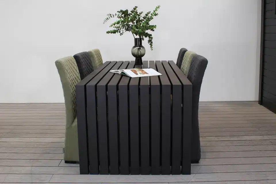 Introductie Fonteyn | Tuinset Klos 01 van FonteynHet Fonteyn | Tuinset Klos 01 van Fonteyn brengt moderne elegantie naar jouw buitenruimte. Deze complete tuinset combineert een stijlvolle rechthoekige tafel van 220 x 100 cm met zes comfortabele stoelen, waarvan vier in een prachtige olijfgroene kleur en twee in een verfijnde antracietkleur. Het aluminium frame zorgt voor duurzaamheid, terwijl het Sunbrella stof van de stoelen uitstekende weersbestendigheid biedt.nnStrakke uitstraling met karakterHet geometrische patroon van verticale latten op zowel tafel als stoelen creëert een tijdloze moderne uitstraling. De bewuste kleurkeuze van olijfgroen en antraciet zorgt voor een verfijnde tweekleurige compositie die perfect aansluit bij hedendaagse tuintrends. Het subtiele gequilte patroon op de stoelbekleding voegt een elegante textuur toe die het geheel visueel interessanter maakt.nnFunctionaliteit die uitnodigt tot samenkomenZes zitplaatsen en een ruime tafelafmeting van 220 x 100 cm bieden deze tuinset volop ruimte voor gezinnen en vrienden. De zithoogte van 44 cm en de ergonomische vorm van de stoelen met hoge rugleuningen zorgen voor optimaal zitcomfort tijdens lange zomeravonden. Het robuuste aluminium frame van de tafel kan moeiteloos het gewicht van volle borden en glazen dragen.nnZekerheid van langdurige kwaliteitFonteyn staat bekend om betrouwbare tuinmeubelen die bestand zijn tegen alle weersomstandigheden. Het aluminium frame blijft sterk en behoudt zijn vorm, terwijl het Sunbrella stof UV-bestendig is en zijn kleur behoudt. Deze materiaalcombinatie garandeert dat jouw tuinset er over jaren nog altijd representatief uitziet en optimaal functioneert. Bezoek de grootste tuinmeubelshowroom van Europa in Uddel met 35.000m² aan inspiratie en test persoonlijk de kwaliteit van deze tuinset. De ervaren experts van Fonteyn adviseren je graag over de perfecte keuze voor jouw tuin. Dankzij de grote voorraad en snelle levering geniet je snel van je nieuwe tuinmeubelen, of bestel direct via de webshop van Fonteyn.n