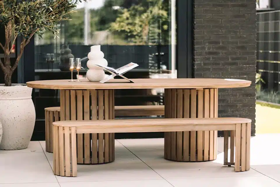 Introductie Fonteyn | Tuinset PureHet Fonteyn | Tuinset Pure van Fonteyn brengt moderne elegantie naar jouw buitenruimte. Deze complete tuinset bestaat uit een prachtige ovale tafel en twee bijpassende bankjes, allemaal vervaardigd uit duurzaam acacia hout. Het kenmerkende ontwerp met verticale houten latten creëert een verfijnde, eigentijdse uitstraling die perfect past bij elke tuinstijl. De warme houtkleur en natuurlijke textuur van het acacia hout geven deze set een luxueuze en uitnodigende uitstraling.nnStijlvolle elegantie voor jouw tuinDeze tuinset straalt moderne sophisticatie uit door het unieke lattenwerk dat elk onderdeel kenmerkt. De luchtige constructie zorgt ervoor dat de set opvallend, maar tegelijkertijd subtiel aanwezig is in jouw buitenruimte. Het natuurlijke acacia hout ontwikkelt een mooie patina over tijd, waardoor jouw tuinset steeds karaktervoller wordt. De ovale vorm en strakke lijnen maken van deze set een echte blikvanger die gasten direct zal opvallen.nnPraktische functionaliteit voor dagelijks gebruikMet de ovale tafel krijg je ruim plaats voor zes tot acht personen, perfect voor gezellige diners en familiebijeenkomsten. Beide bankjes bieden elk drie personen comfortabel plaats en zijn handig onder de tafel te schuiven wanneer je extra ruimte wilt creëren. Het gladde tafelblad vormt een stabiel oppervlak voor servies, decoraties en alles wat je tijdens buitenmaaltijden gebruikt. De stevige constructie garandeert dat jouw tuinset jarenlang betrouwbaar functioneert.nnEenvoudig onderhoud voor maximaal gemakAcacia hout vraagt minimaal onderhoud dankzij zijn natuurlijke weerbestendigheid. De open structuur van de verticale latten zorgt voor optimale ventilatie, waardoor het hout snel droogt na regen. Een jaarlijkse behandeling met transparante houtbeits houdt de oorspronkelijke kleur mooi, hoewel het hout ook prachtig vergrijst als je het onbehandeld laat. Het onderhoud bestaat hoofdzakelijk uit af en toe afstoffen en eventueel een behandeling, waardoor je extra tijd hebt om van jouw tuin te genieten.n