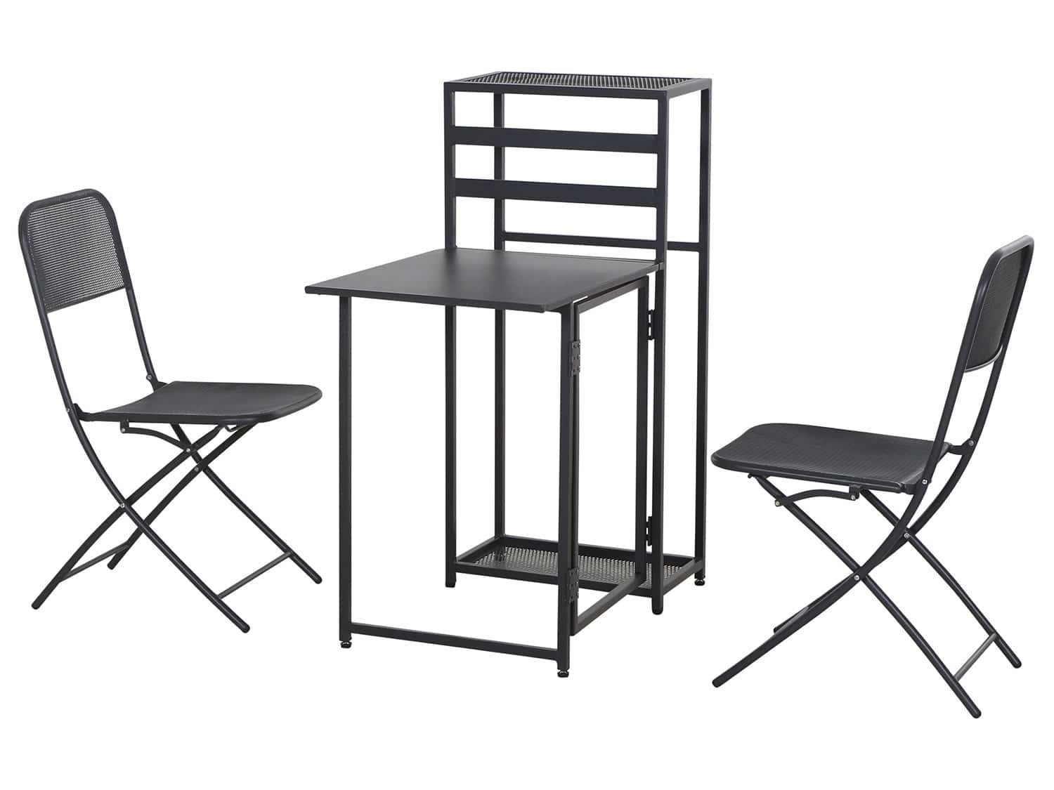 Compacte balkonset in stijlvol design Van gepoedercoat staal Bijzonder stevig en stabiel Tafel en stoelen zijn inklapbaar 3-delig Set bevat:2 fauteuils + tafel of 2 banken + tafel Materiaal Staal Afmetingen Balkonmeubelset met stoel Stoel: ca. b 38 cm x h 85 cm x d 40 cm Tafel: ca B 90 cm x H 106 cm x D 50 cm Balkonmeubelset met bank Bank: ca. B 108 cm x H 41,5 cm x D 40,5 cm Tafel: ca B 116 cm x H 73,5 cm x D 56 cm Gewicht Balkonmeubelset met stoel Stoel: ca.5 kg Tafel: ca. 12,98 kg Balkonmeubelset met bank Bank: ca. 6,9 kg Tafel: ca. 9,9 kg