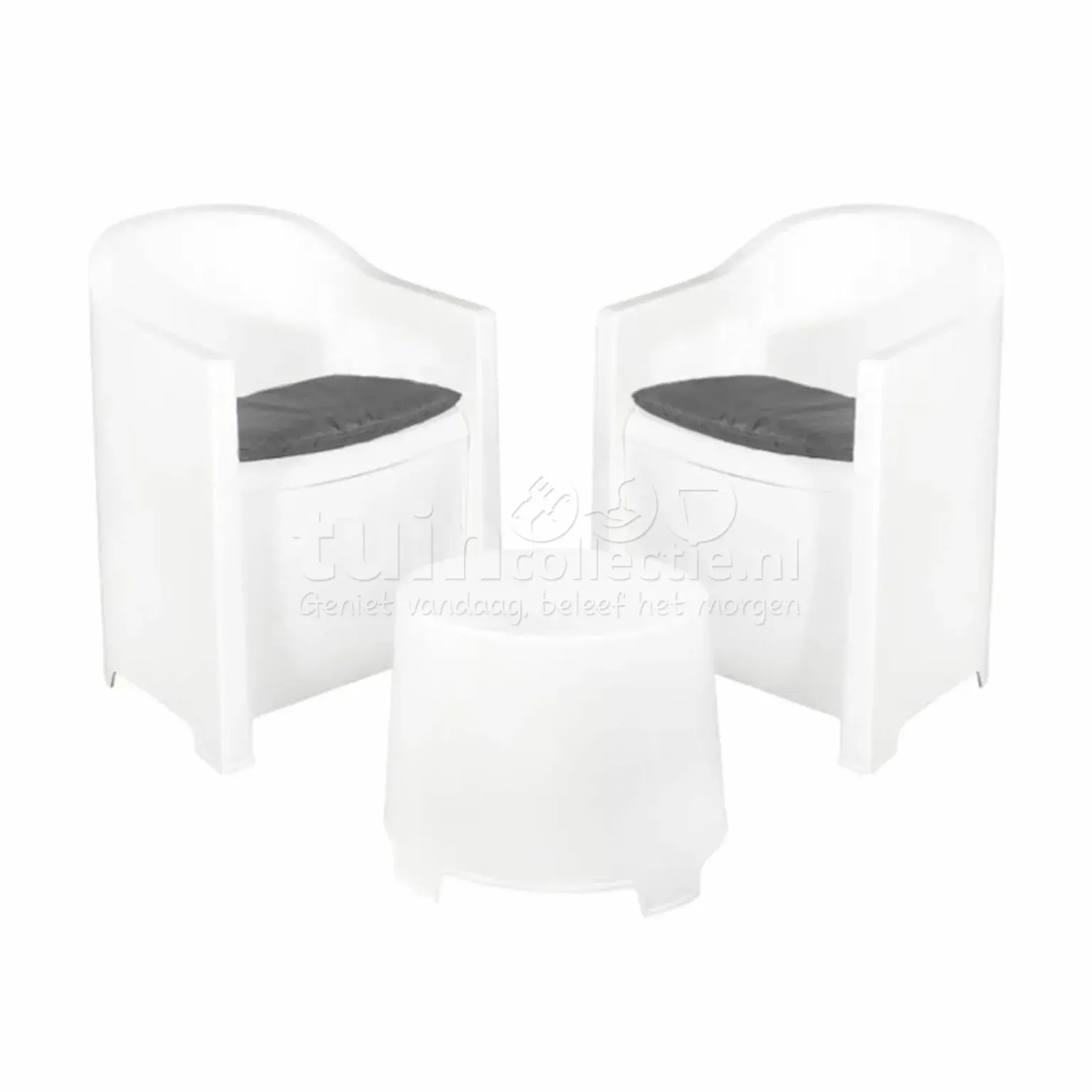 Tuinset Luna van ProGarden is een basic, maar leuk en compact tuinsetje voor op het terras of balkon. De tuinset bestaat uit 2 tuinstoelen en een ovaal tafeltje. Alle onderdelen zijn volledig gemaakt van kunststof en zijn wit van kleur. Hij heeft ronde vormen en geeft daardoor een speels effect aan je buitenruimte. Doordat tuinset Luna gemaakt is van kunststof, is hij weerbestendig en kan jaarrond buiten blijven staan. Tevens wordt de tuinset geleverd met 2 grijze kussentjes voor in de stoelen. Elke stoel heeft een afmeting van 53x59x75cm en het tafeltje is 41x35x38cm groot. Geef jij jouw buitenruimte sfeer en een zomerse uitstraling met dit 3-delige Luna tuinsetje?!