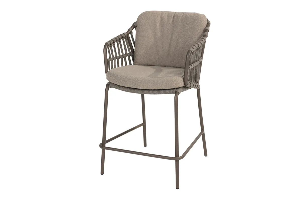 Het 4 Seasons Outdoor | Capalbio High DiningstoelHet 4 Seasons Outdoor | Capalbio High Diningstoel van Fonteyn brengt verfijnde elegantie naar jouw buitenruimte. Deze hoogwaardige barstoel combineert modern design met duurzame materialen en doordachte constructie. Het gevlochten koordpatroon aan de achterkant creëert een opvallend visueel element dat zowel functioneel als decoratief is, terwijl het neutrale kleurenpalet perfect aansluit bij verschillende tuinstijlen.nnJouw terras krijgt stijlvolle allureDeze diningstoel straalt warme sophistication uit door de prachtige taupekleurige afwerking en het elegante gevlochten design. Het neutrale kleurenschema zorgt ervoor dat de stoel harmonieus past bij bestaande tuinmeubels en decoratie. De combinatie van het strakke metalen frame met de zachte, organische textuur van het vlechtwerk creëert een uitstraling die zowel eigentijds als tijdloos aanvoelt.nnComfort dat perfect werktOptimale ondersteuning biedt deze stoel dankzij de ergonomisch gevormde rugleuning en het comfortabele zitkussen. Het robuuste onderstel garandeert stabiliteit tijdens gebruik, terwijl de verhoogde zithoogte ideaal is voor bartafels en hoge eettafels. De open gevlochten structuur zorgt voor luchtige ventilatie, waardoor je ook tijdens warme dagen comfortabel kunt zitten.nnPraktische eigenschappen die jou bevallenDuurzame materialen maken deze barstoel tot een onderhoudsarm meubel dat bestand is tegen verschillende weersomstandigheden. Het gevlochten koordwerk behoudt zijn vorm en kleur, terwijl het metalen frame zijn stabiliteit behoud. Compacte afmetingen zorgen ervoor dat de stoel gemakkelijk te plaatsen is en efficiënt ruimtegebruik mogelijk maakt in elke buitenruimte.n