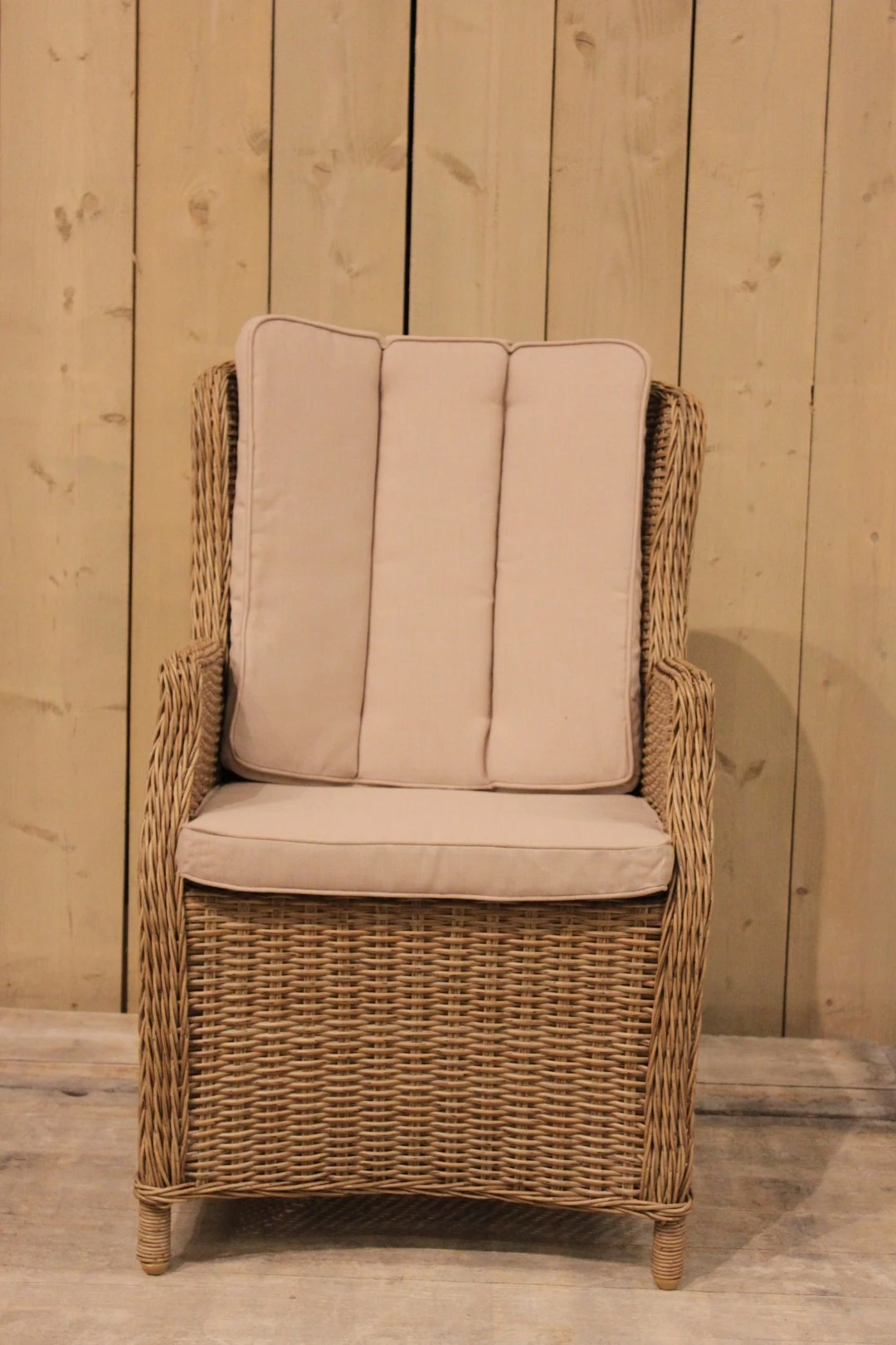 Darwin verstelbare stoel rotan grey. Darwin verstelbare stoel rattan grey is een stijlvolle stoel van Eurofleur Aanbieding. Darwin stoel met licht grijze / beige gekleurde kussens (rattan grey). Is wel verstelbaar en heeft armleuningen aan allebei de kanten. Dit artikel is gemaakt van natuurlijk hout. In het artikel zitten oneffenheden. Dit geeft het product meer een vintage uitstraling. Bij droog weer kunnen de stoelen prima buiten staan. Dit product kan prima buiten staan, maar bij vochtigheid zoals (spat) regenwater kan voor een minder lange levensduur zorgen. Er zit bij dit artikel geen garantie op schade door vocht, krassen of scheuren. Indien u een 100% puntgaaf product wil, adviseren wij dit artikel niet te kopen.