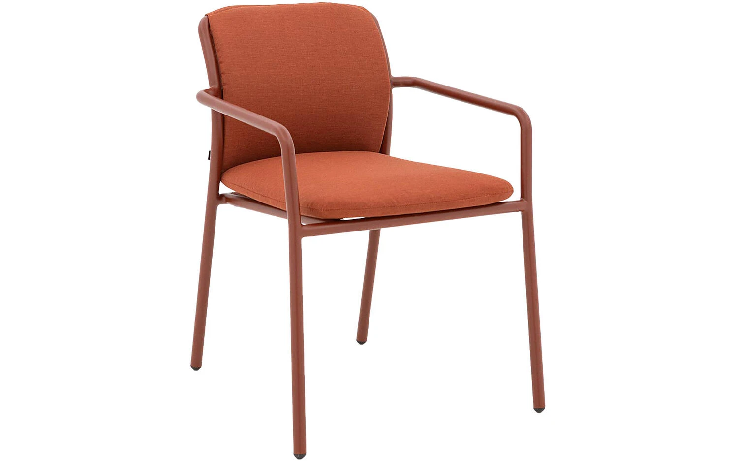 Oranje tuinstoel Bibione met armleuning maakt van elke zitplek in de tuin een kleurrijke ontmoetingsplek. Het frame is gemaakt van aluminium met een brique poedercoating en de stoelzitting is bekleed met een stevig olefin weefsel. Dankzij de armleuningen zit je comfortabel en ontspannen, of je nu luncht op het terras of geniet van een kopje koffie in de tuin.
