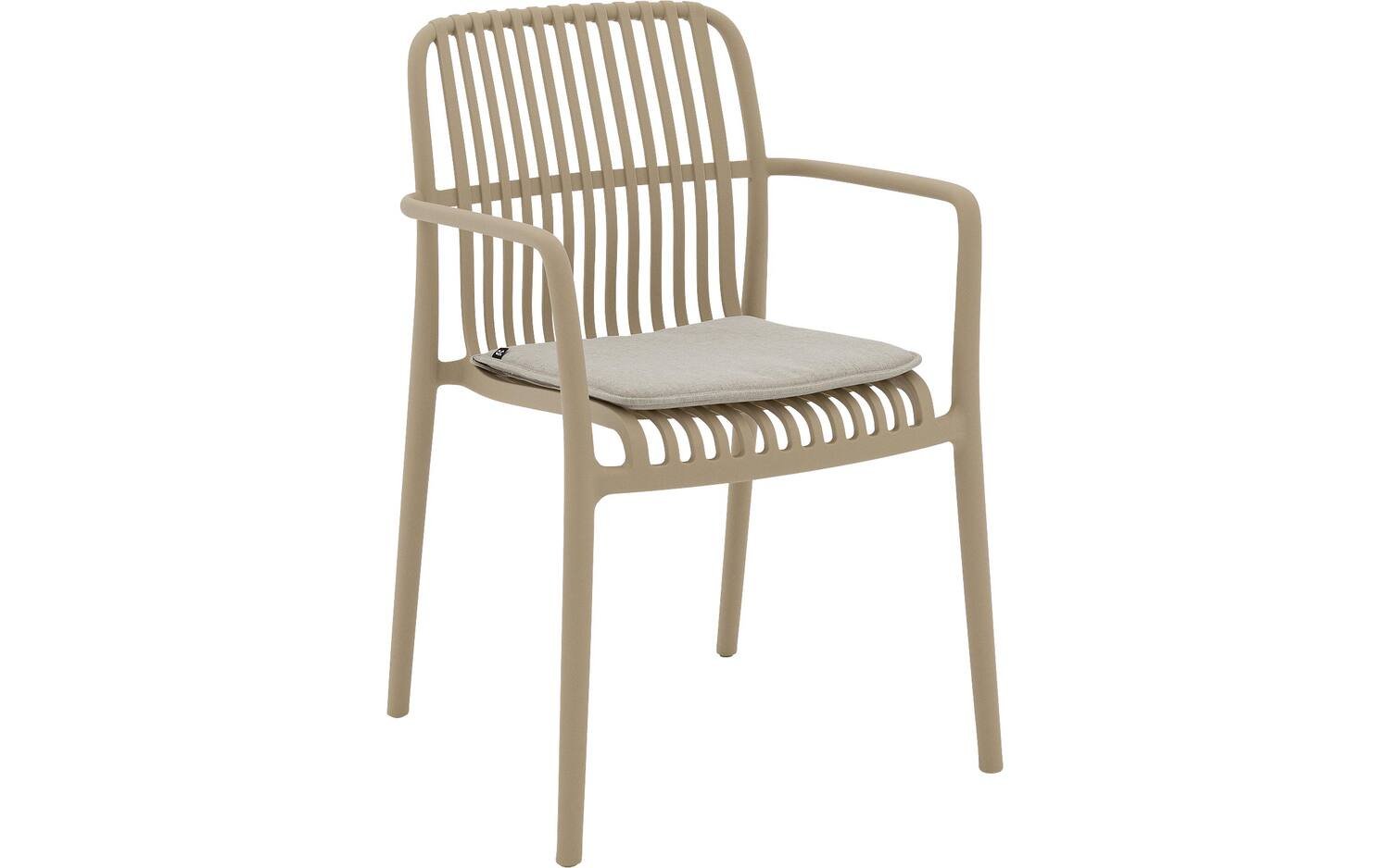 De warme khaki kleur geeft tuinstoel Jelke een moderne, rustige uitstraling die goed combineert met houten en antraciet tuinmeubels. Een veelzijdige stoel voor elke tuinstijl.