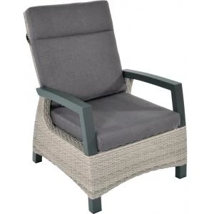 Prato Mountain verstelbare lounge tuinstoel Specificaties Afmetingen: 72 x 80 x 104 cm Materiaal frame: Aluminium Materiaal afwerking: Wicker 8x2mm / 7×2.2mm / 14×2.3mm Kleur wicker: Beige Kleur kussens: Grijs Rugleuning traploos verstelbaar dmv gasv…