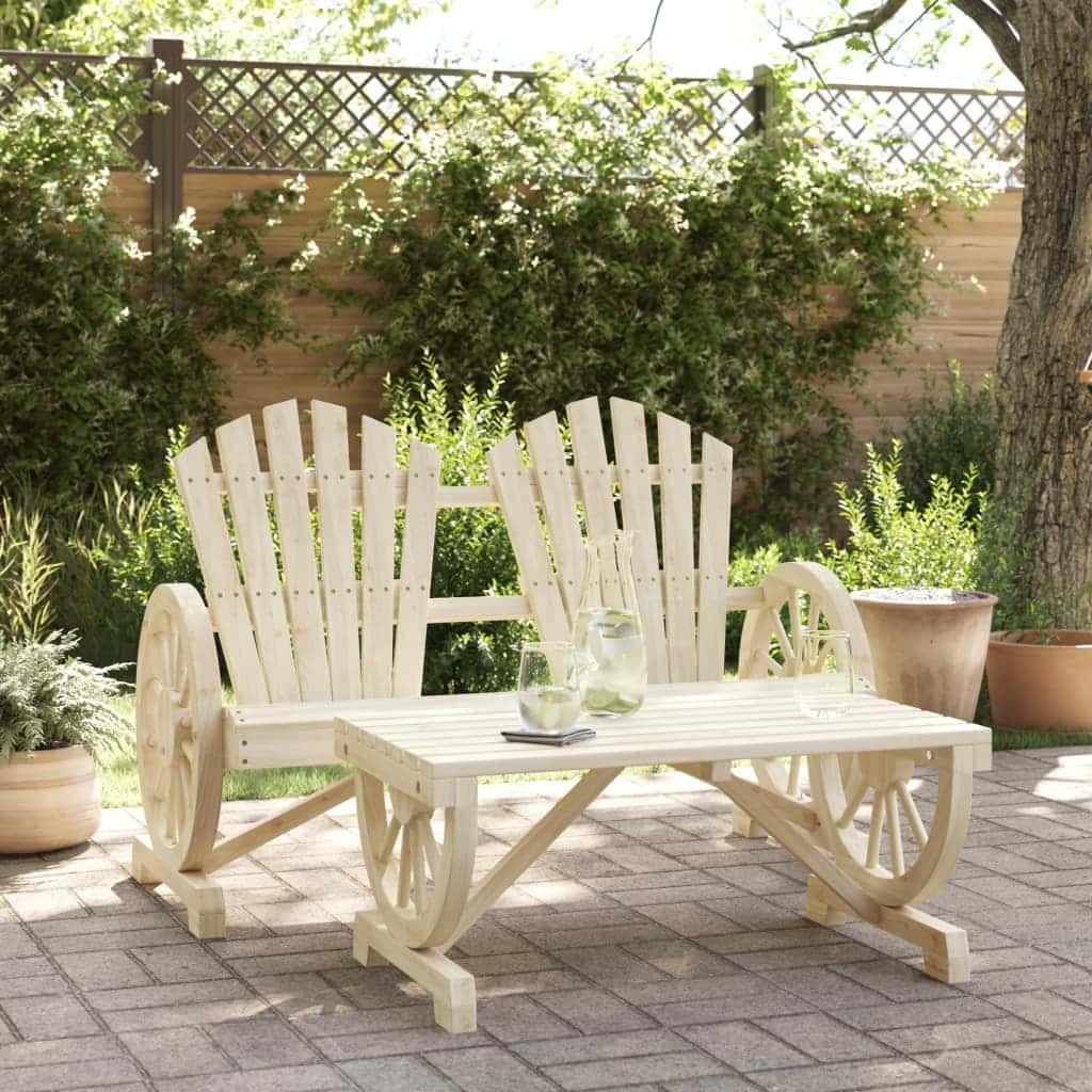 Geniet van je vrije tijd met deze houten loungeset in Adirondack stijl. Massief vurenhout: massief vurenhout is een prachtig en duurzaam materiaal dat zijn kracht behoudt, zelfs wanneer het wordt blootgesteld aan vocht. Het droogt niet uit en trekt niet krom, waardoor het een betrouwbare keuze is.Comfortabel zitten: de tuinstoel heeft een ergonomische zitting en een schuine rugleuning voor optimaal zitcomfort. De armleuningen, in de vorm van wielen, bieden een comfortabele plek om je armen te laten rusten.Praktische tafel: de salontafel is perfect voor het plaatsen van drankjes, etenswaren en decoratieve voorwerpen. Goed om te weten:Om de levensduur van je tuinmeubelen te verlengen, raden wij je aan om de meubelen met een waterbestendige hoes af te dekken.
