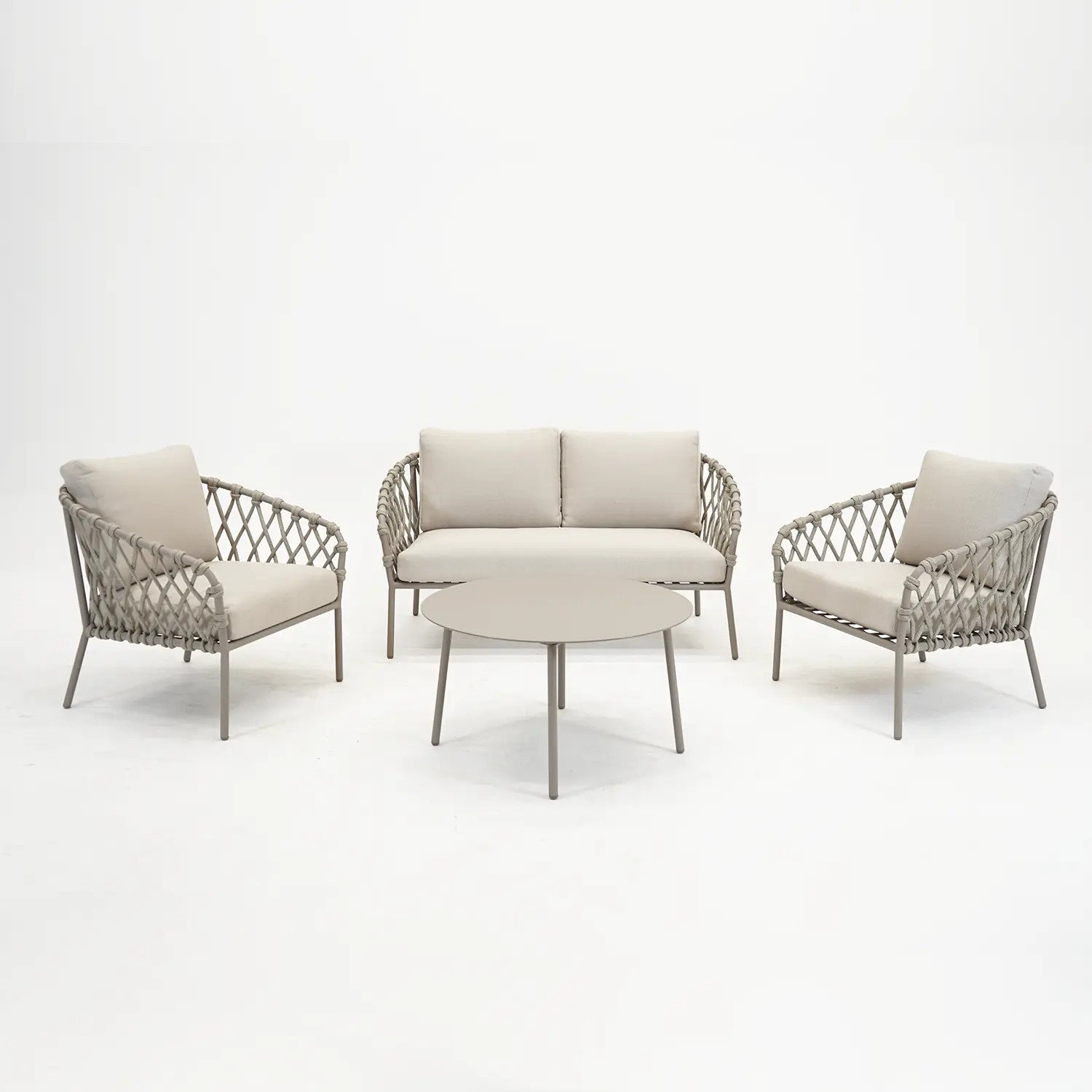 De Tanami loungeset bestaat uit een ruime 2-zitsbank, twee comfortabele loungestoelen en een stijlvolle, ronde koffietafel. Dankzij de luchtige taupe kleur en het gevlochten rope design krijgt de set een moderne, mediterrane uitstraling die naadloos aansluit op verschillende tuinstijlen – van boho chic tot strak en minimalistisch.