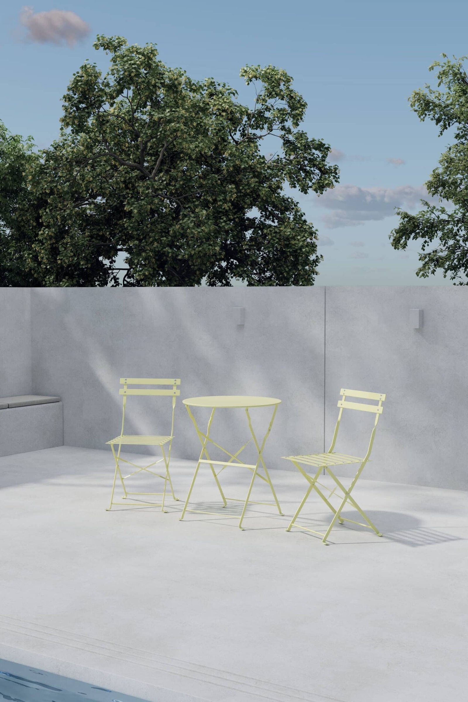 Geef je terras of balkon een zonnige en levendige uitstraling met de Franki caféset in lichtgeel. De set bestaat uit een ronde tafel en twee klassieke caféstoelen in een praktisch en stijlvol ontwerp, perfect voor zowel kleine als grote ruimtes.