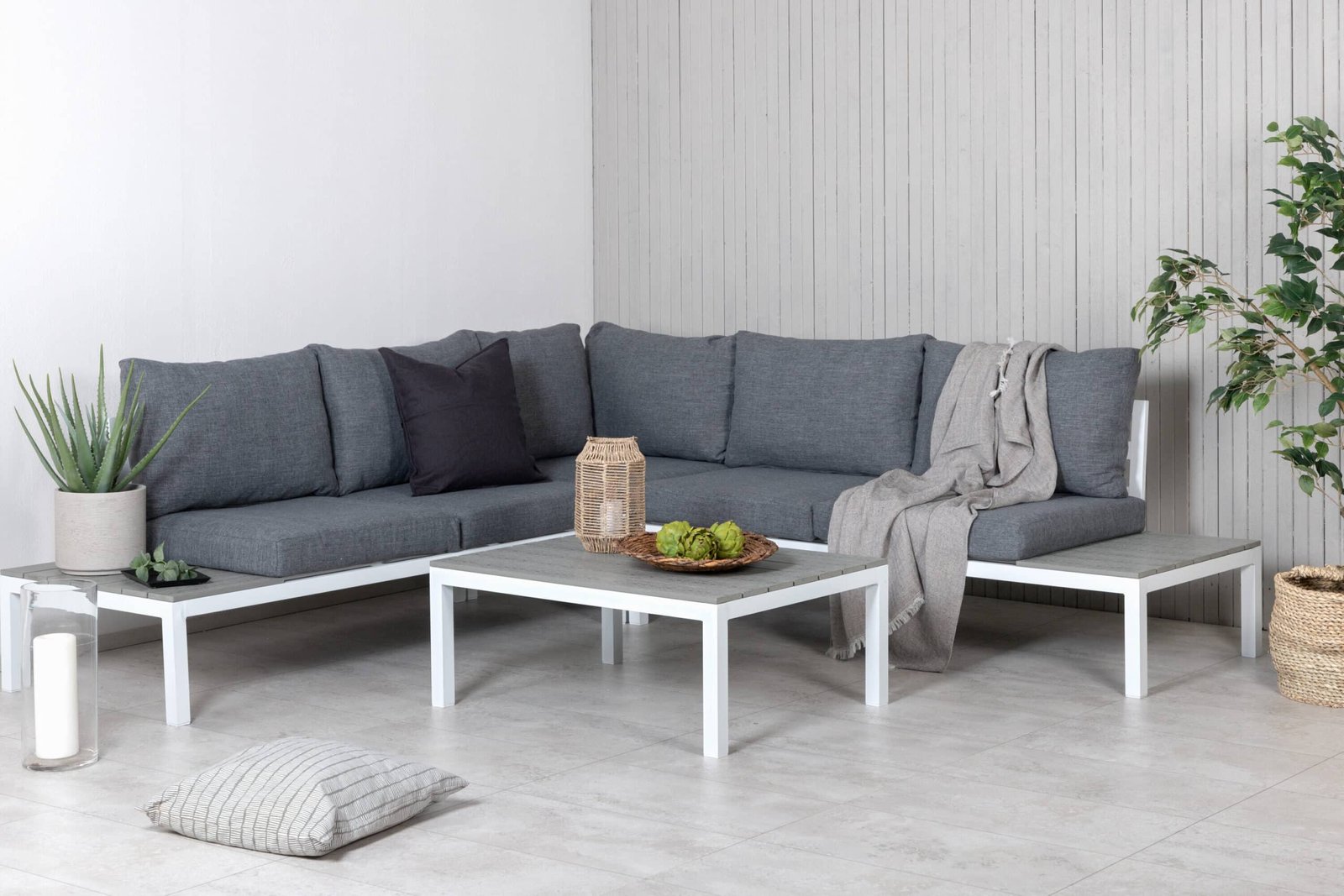 Stijlvol, slim en duurzaam – een perfecte bankgroep voor op het terras deze zomer! Farzana is een klassieke en eenvoudige hoekgroep in heerlijk lounge design met een zwart frame van aluminium en grijze bovenschijf van polywood. Aan elke kant van de bank staan kleine bijzettafeltjes, perfect voor extra reliëf. De bankgroep is geschikt voor buitengebruik en past net zo goed in de tuin als in de hoek van het balkon. Er worden grijze kussens meegeleverd die de groep even stijlvol als comfortabel maken!