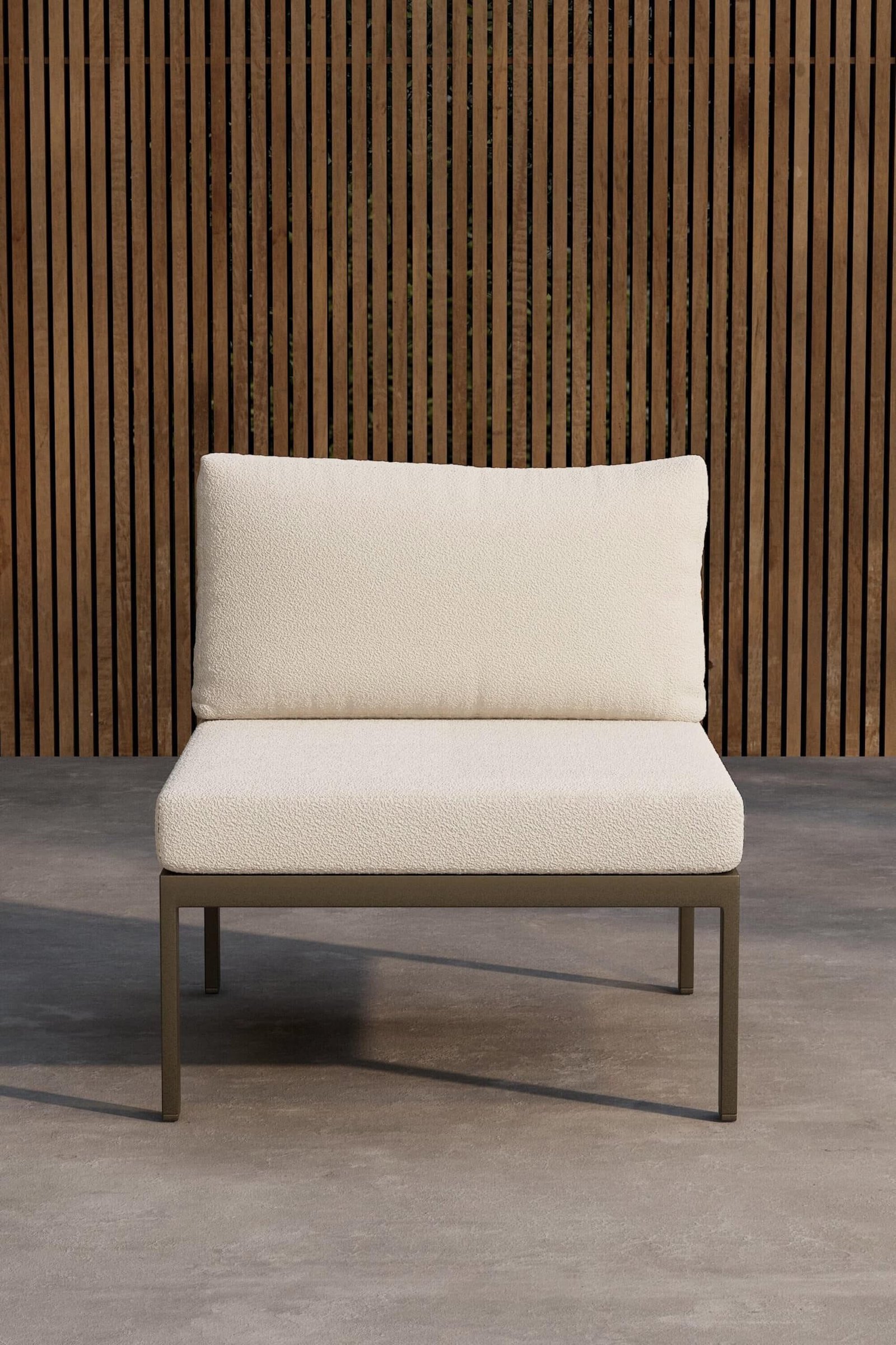 De Lasheka middenmodule is een stijlvol en flexibel onderdeel van onze populaire Lasheka-serie. Met een stevig bruin frame en zachte kussens van witte bouclé-stof zorgt hij voor een moderne en elegante uitstraling. Je kunt hem alleen gebruiken als comfortabele zitplaats of combineren met andere meubels uit de serie om een bankstel samen te stellen dat perfect past bij jouw buitenruimte. De Lasheka middenmodule combineert comfort en design in een tijdloos geheel.