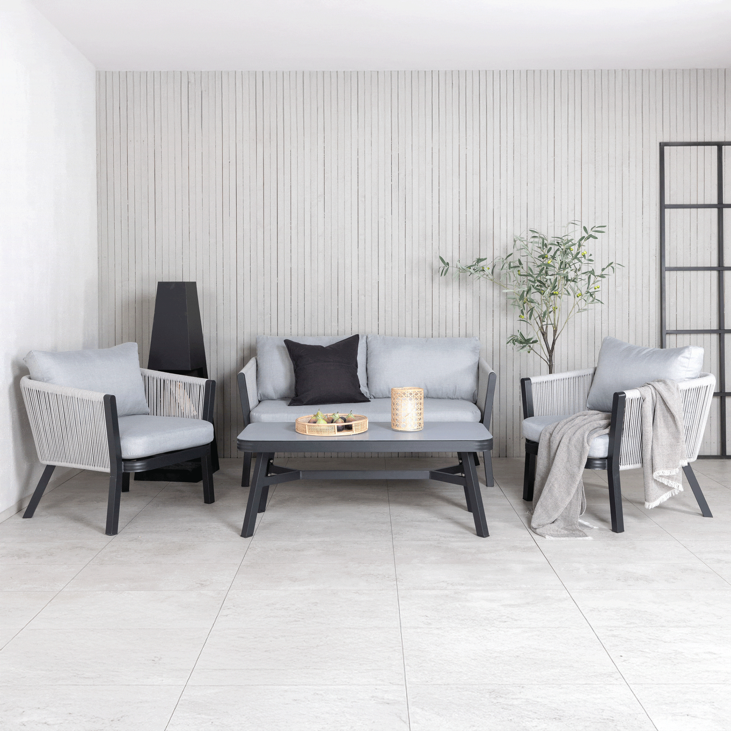 Sauel is een moderne loungezit met een focus op comfort – hij past perfect op het terras of balkon. De meubelgroep bestaat uit een tweezitsbank, twee frame-fauteuils van zwart gepoedercoat metaal met een rugleuning van lichtgrijs touw. Bij de groep horen lichtgrijze zachte kussens en een rechthoekige lage salontafel met een grijs afgewerkt tafelblad dat past bij de touwen en de tint van de kussens en een exclusief geheel vormt. Geniet van comfortabele zomeravonden in een aangename bankgroep!