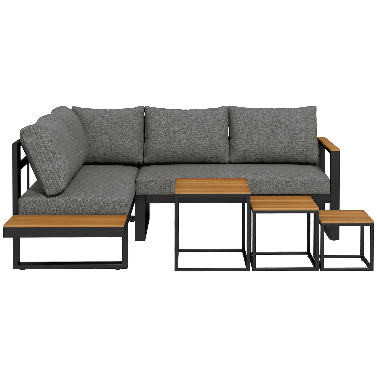 Breng het comfort van binnen naar buiten met Outsunny. Outsunny biedt een outdoor sofa set waarmee je jouw veranda of terras kunt uitbreiden met comfortabele zitgelegenheid. Deze set bestaat uit 2 banken en 3 salontafels die je afzonderlijk kunt gebruiken of kunt combineren tot een hoekbank. De zitoppervlakken zijn volledig gestoffeerd en aan de zijkant bevindt zich een handige salontafel om belangrijke spullen binnen handbereik te hebben. Ga naar buiten, maak het gezellig en geniet van Outsunny.