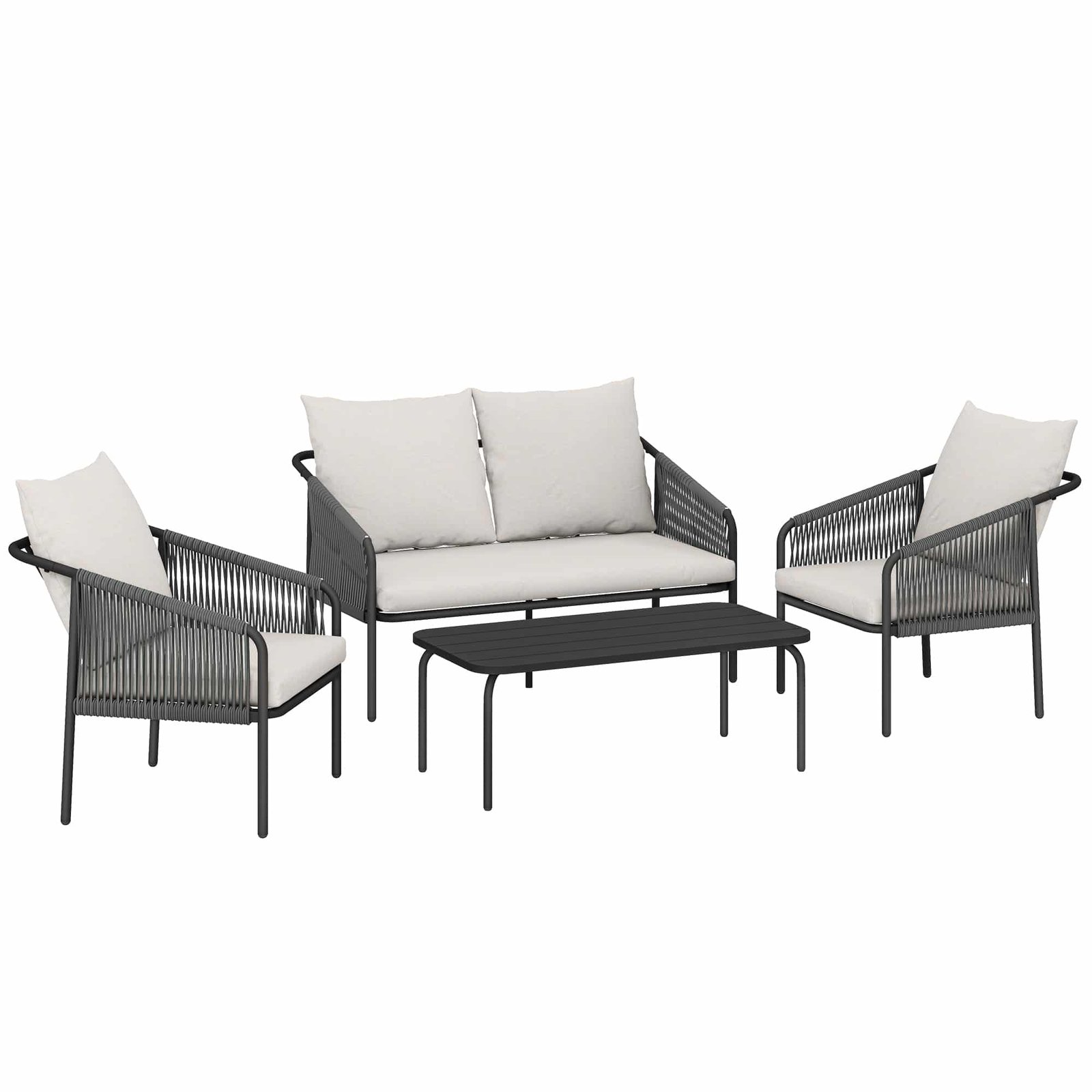 Outsunny Tuinmeubelset 4-delig polyrattan loungeset met tweezitsbank, 2 fauteuils, salontafel, afneembare kussens met banden