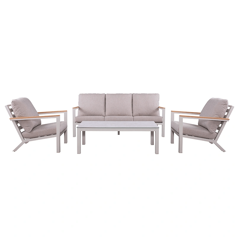 OWN Cardiff Sofa Loungeset 5 – Beige is de perfecte mix van design en functionaliteit, uitgevoerd in beige en vervaardigd uit aluminium en teak en keramiek. Een echte blikvanger die uitnodigt tot ontspannen in de buitenlucht.