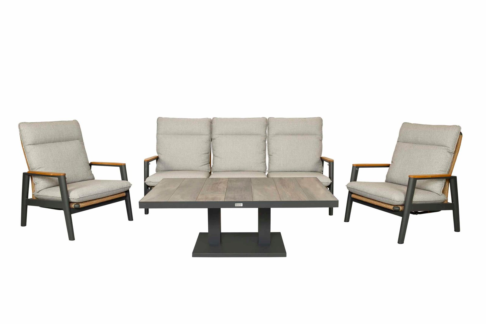 De Yvori serie is onderhoud vriendelijk met een aluminium frame dat is gepoedercoat in de kleur Royal grey. Het vlechtwerk heeft een natuurlijke uitstraling vooral met de teakhouten armleggers.